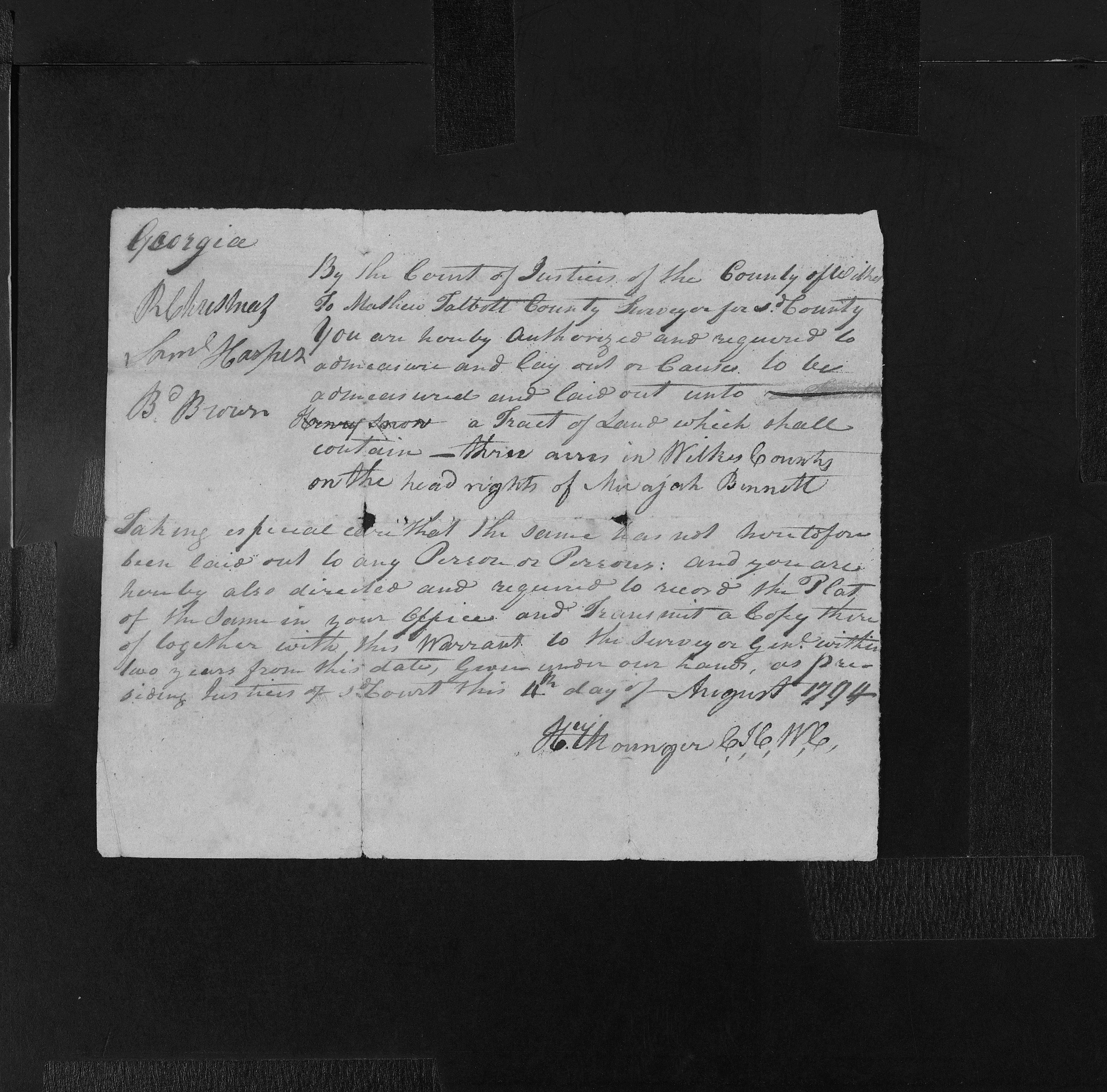 | Property | Mycajah Bennett received headrights to land in Wilkes Co GA, but he gave some of it (3 acres) to his brother in law Henry Snow, as recorded in the Georgia Archives |