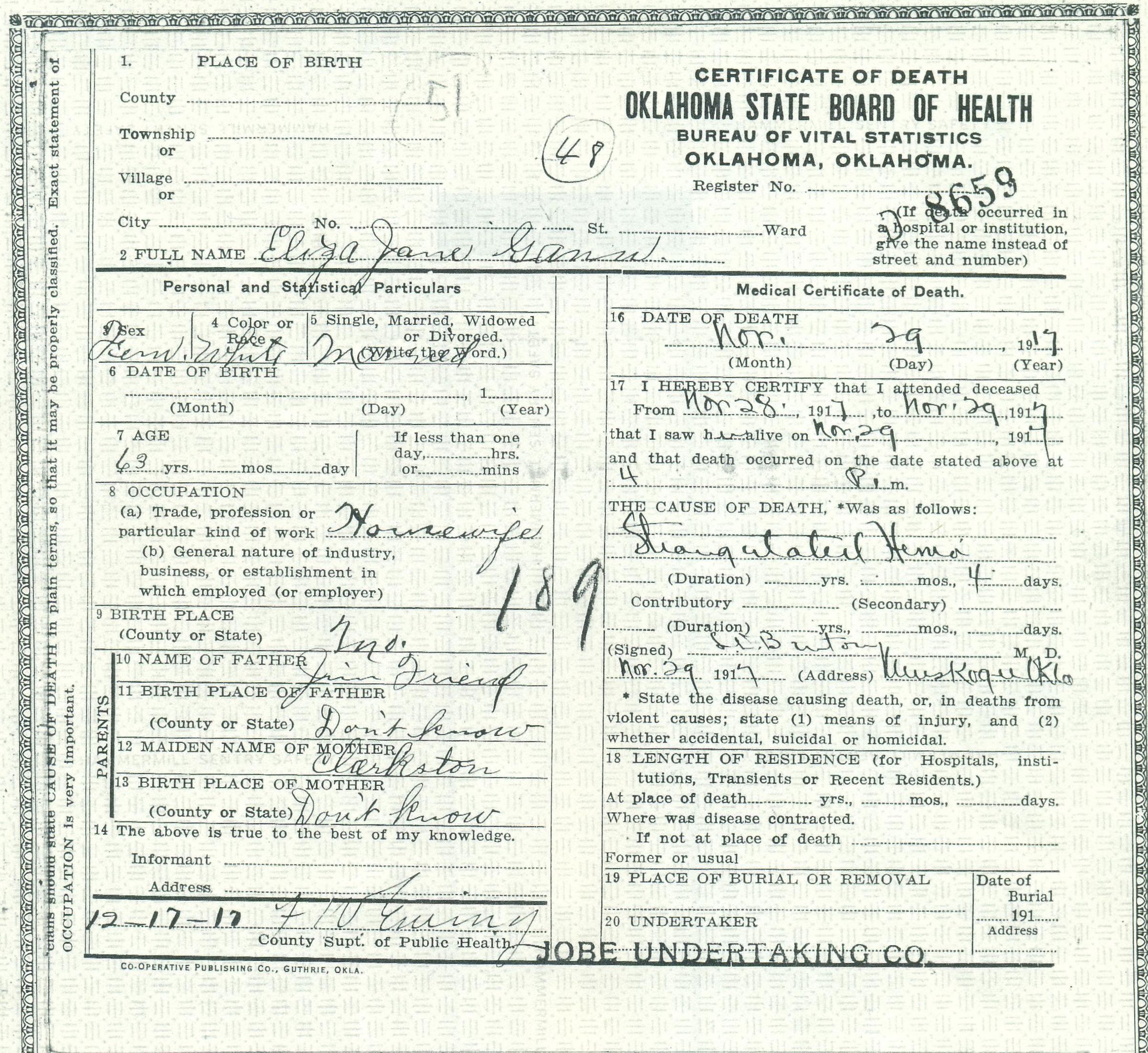 Dorthy GANN Birth: March 14, 1914 31 34 — Coweta, Wagoner Co, OK Death: June 17, 1914 — Muskogee, Muskogee Co, OK |