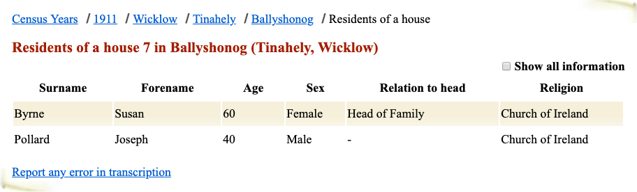 Susan GRIFFIN Birth: 1861 48 — Co Wicklow, Ireland Death: December 28, 1929 — Ballyshonoge, Tinahely, Wicklow, Ireland |