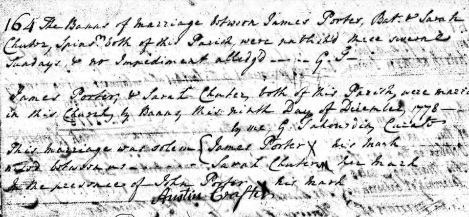 Marriage of a child | James PORTER — Sarah CHUTER — View this family December 9, 1778 (Age 43 years) Note: From the Frensham parish records: James Porter and Sarah Chuter, both of Frensham married 9 Dec 1778. Witness: John Porter. John Porter was also married in this parish: 26 Jan 1768, John Porter (Bramshott of the County of Southampton) & Elizabeth Pacey.