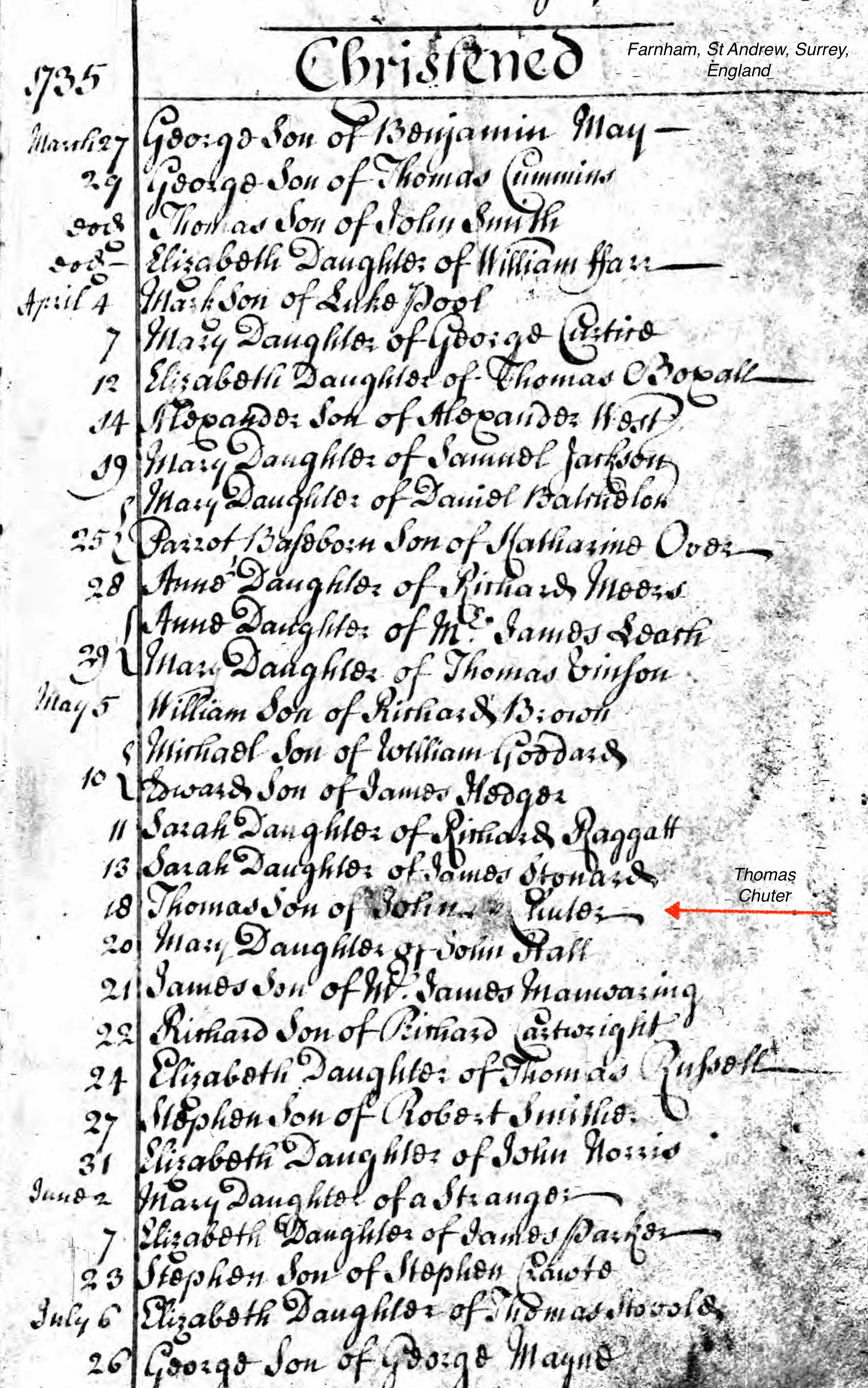 | Baptism | Surrey, England, Church of England Baptisms, Marriages and Burials, 1538-1812 For Thomas Chuter on ancestry.com Event Type: Baptism Baptism Date: 18 May 1735 Baptism Place: Farnham, St Andrew, Surrey, England Father: John Chuter Likely baptism record for Thomas Chuter, husband of Sarah Jeffrey. Thomas' death record indicated he was born in 1732. |