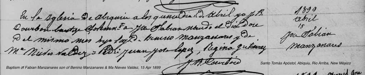 Jose Fabian MANZANARES Baptism: April 15, 1899 38 33 — Santo Tomás Apóstol, Abiquiu, Rio Arriba, New Mexico |