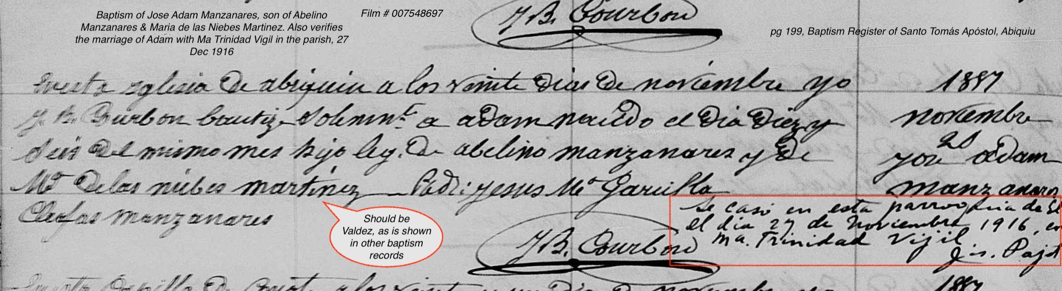 | Baptism | New Mexico Births and Christenings For Adam Manzanares Christening Date 20 Nov 1887 Christening Place Santo Tomás Apóstol, Abiquiu, Rio Arriba, New Mexico Birth Date 16 Nov 1887 Birthplace Abiquiu, St Thomas The Apostle, Rio Arriba, New Mexico Father's Name Abelino Manzanares Mother's Name Maria De Las Niebes Martinez [Valdez, it's clear from other baptism records that her name was Valdez, not Martinez.] |