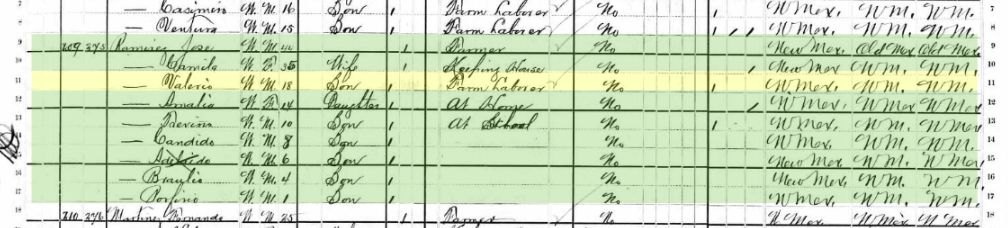 | Census | United States Federal Census For Valerio Ramirez Birthplace: New Mexico Territory Home in 1880: Rincon Del Tecolote, San Miguel, New Mexico, USA Father's name: Jose Ramirez Father's Birthplace: New Mexico Mother's name: Camila Ramirez Mother's Birthplace: New Mexico Occupation: Farm/Laborer Attended School: Yes Name Age Jose Ramirez 44 Camila Ramirez 35 Valerio Ramirez 18 Analia Ramirez 14 Trevino Ramirez 10 Candido Ramirez 8 Adelaido Ramirez 6 Braulio Ramirez 4 Porfino Ramirez 1 |