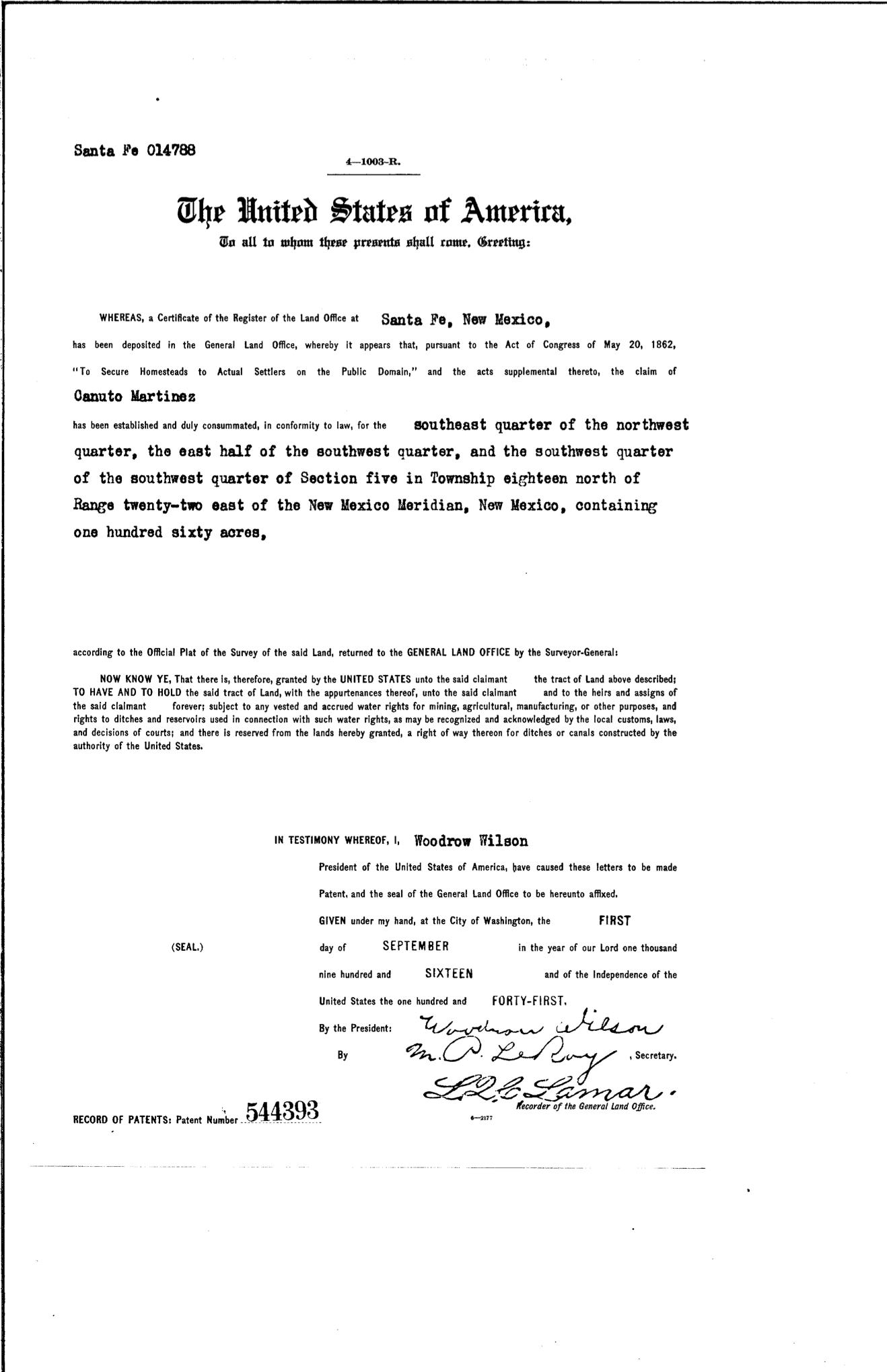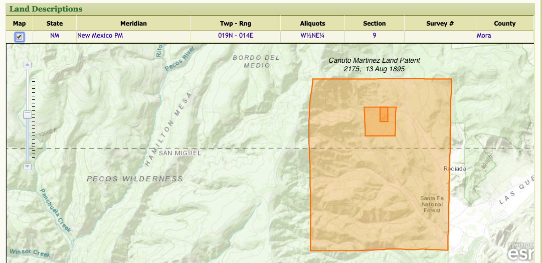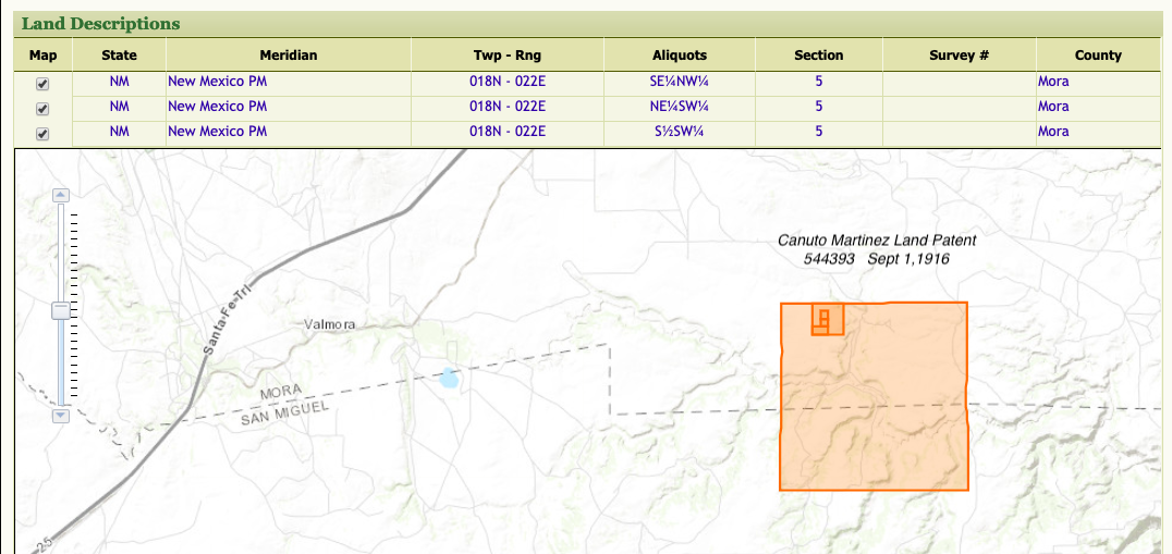 Property | Mora County 1916 (2 years after death)Note: Canuto Martinez received his second land patent on the San Miguel/Mora County boundary near Rociada in 1916.