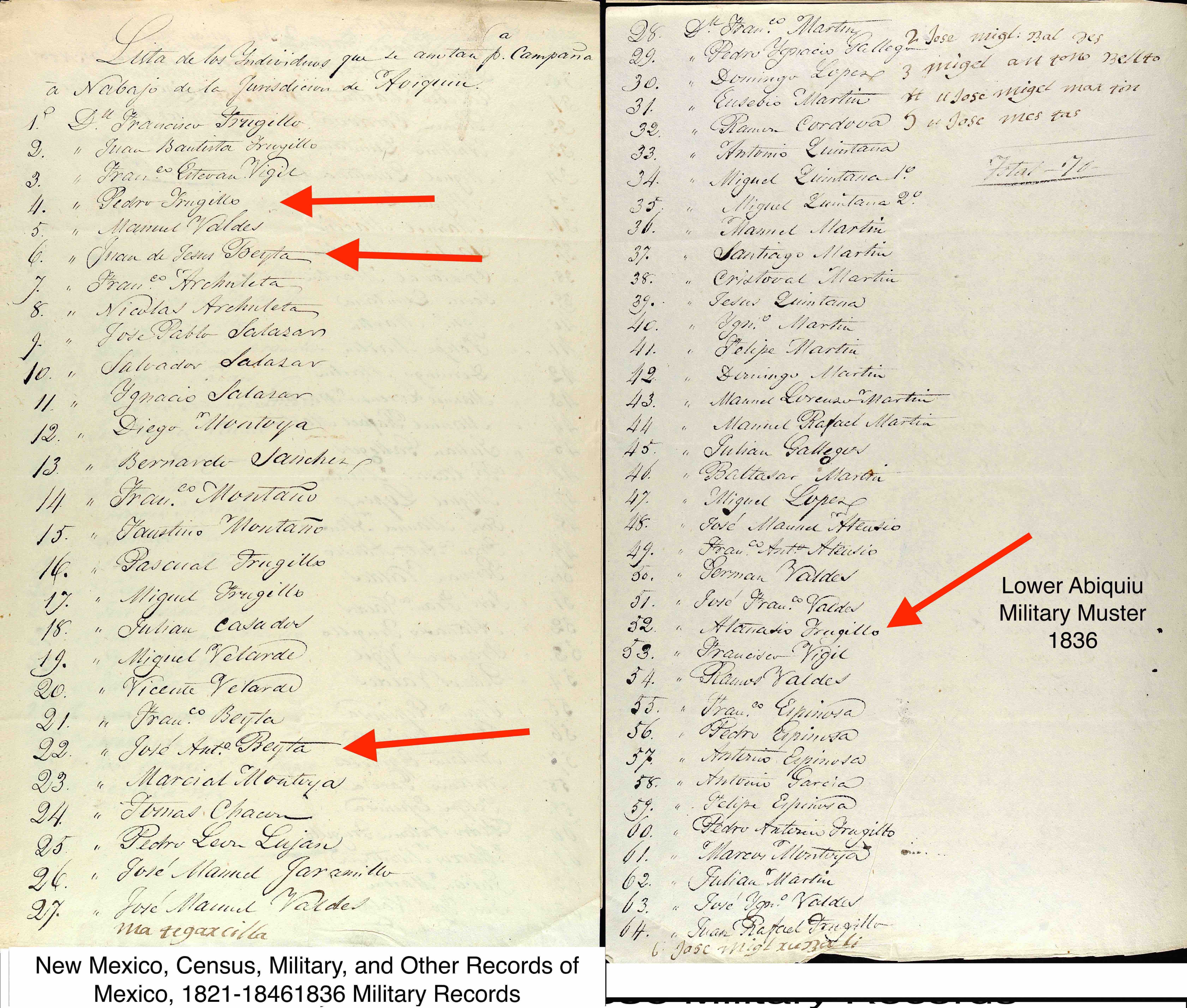 | Census | Loreto Trujillo is head of household, age 55, with Antonio, Bonifacia, Miguel and Jesus Abeita. She is living next to Pedro Trujillo, age 85. |