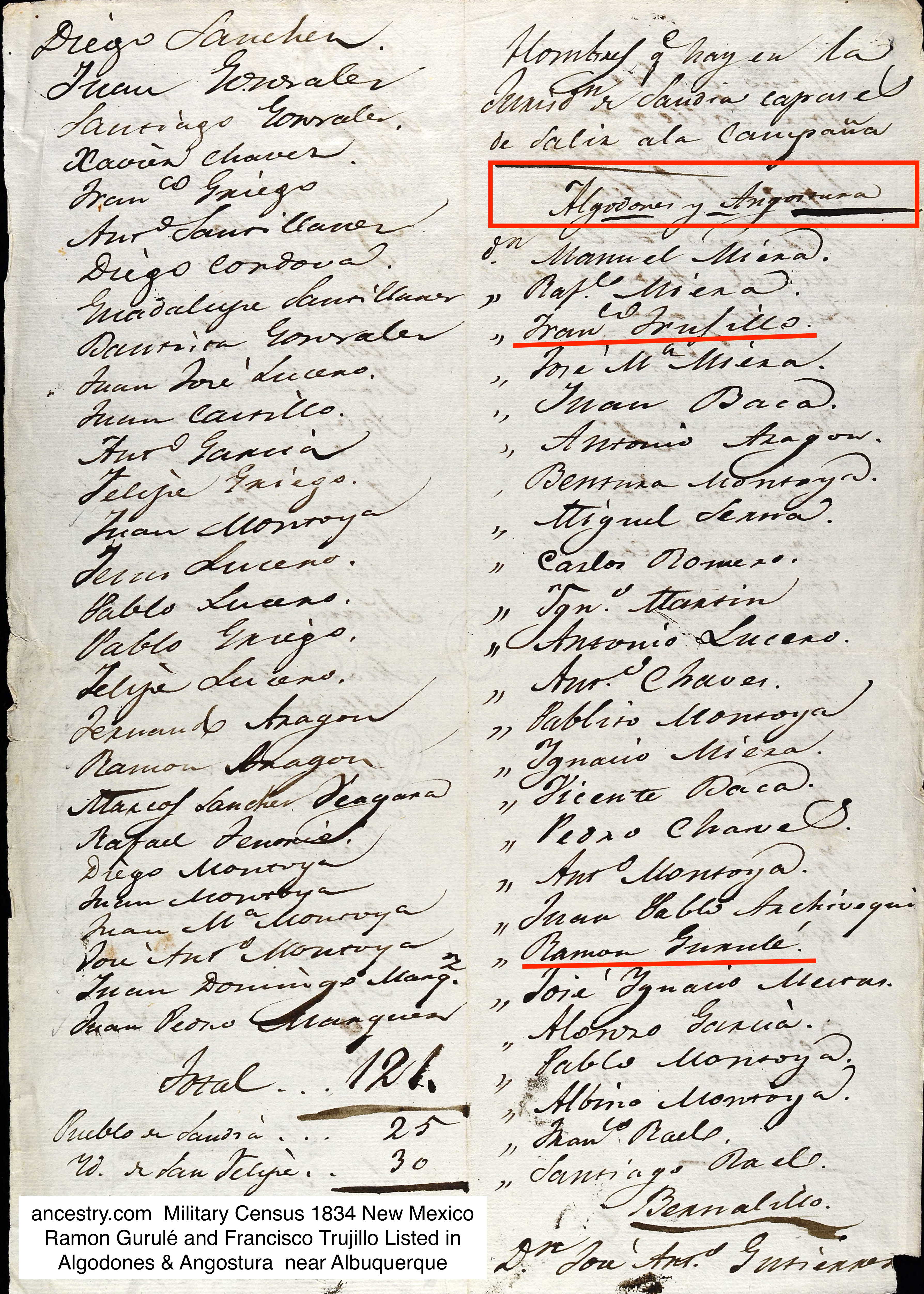 | Census | Enumerated in the 1803-1807 census at Las Huertas, NM Toribio Gurulé (1754, age 53, widower), Ramon (1789, age 18), Cristiana (1791, age 16), Micaela (1792, age 15) |