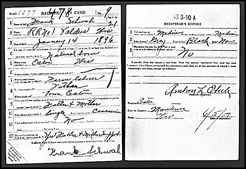Frank Simon SCHWAB Birth: January 14, 1896 33 25 — Eaton WI Death: July 1, 1981 — Calumet Co WI |