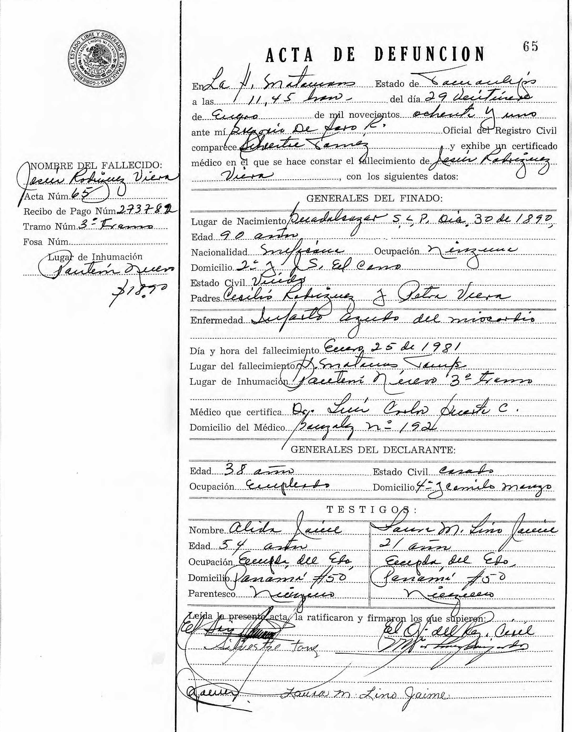 Jesus RODRIGUEZ VIERA Birth: December 30, 1890 31 — Guadalcazar, San Luis Potosi, Mexico Death: January 25, 1981 — Matamoros, Tamaulipas, Mexico |