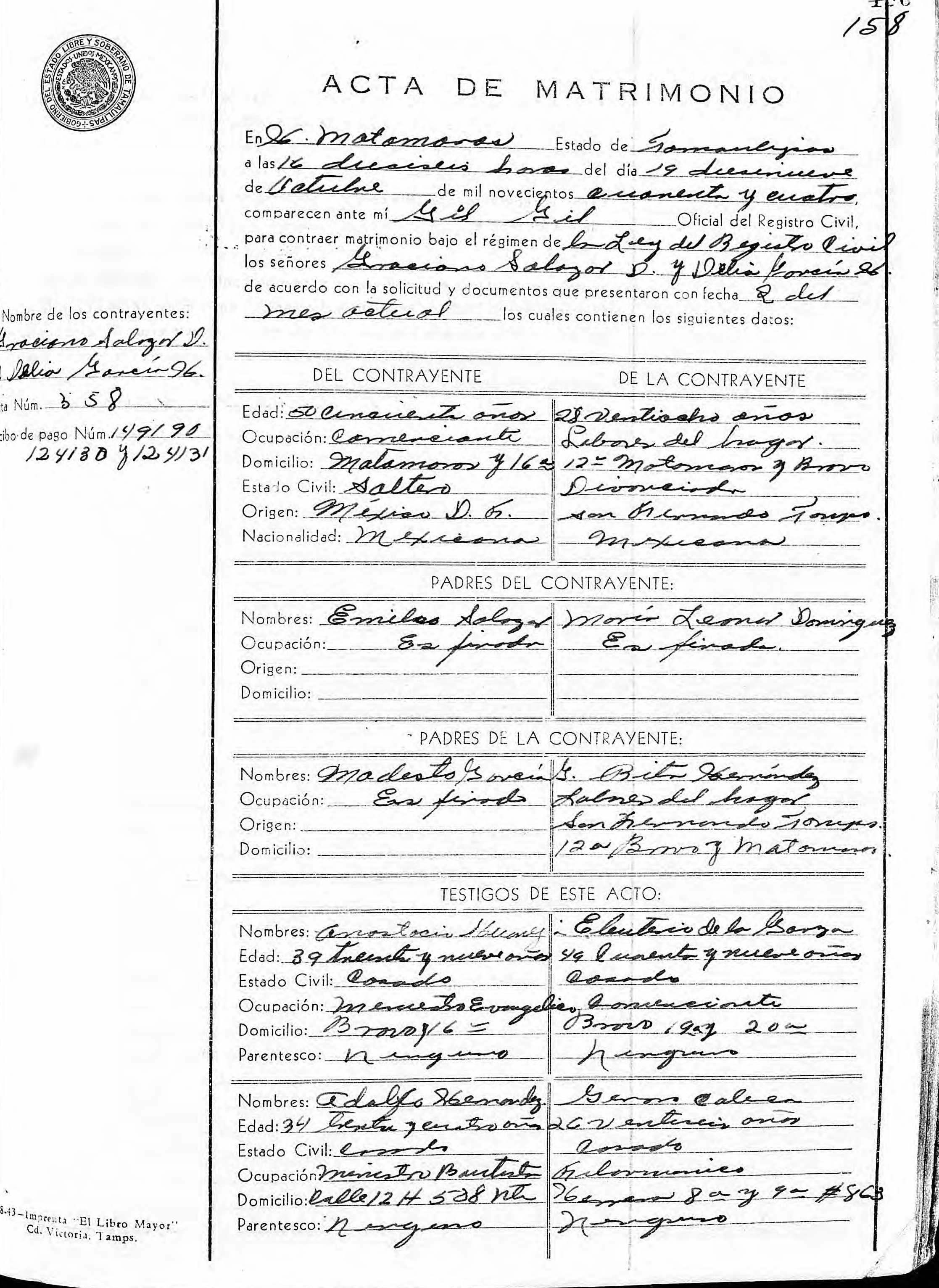 Marriage: October 19, 1944 — Matamoros, Tamaulipas, Mexico |