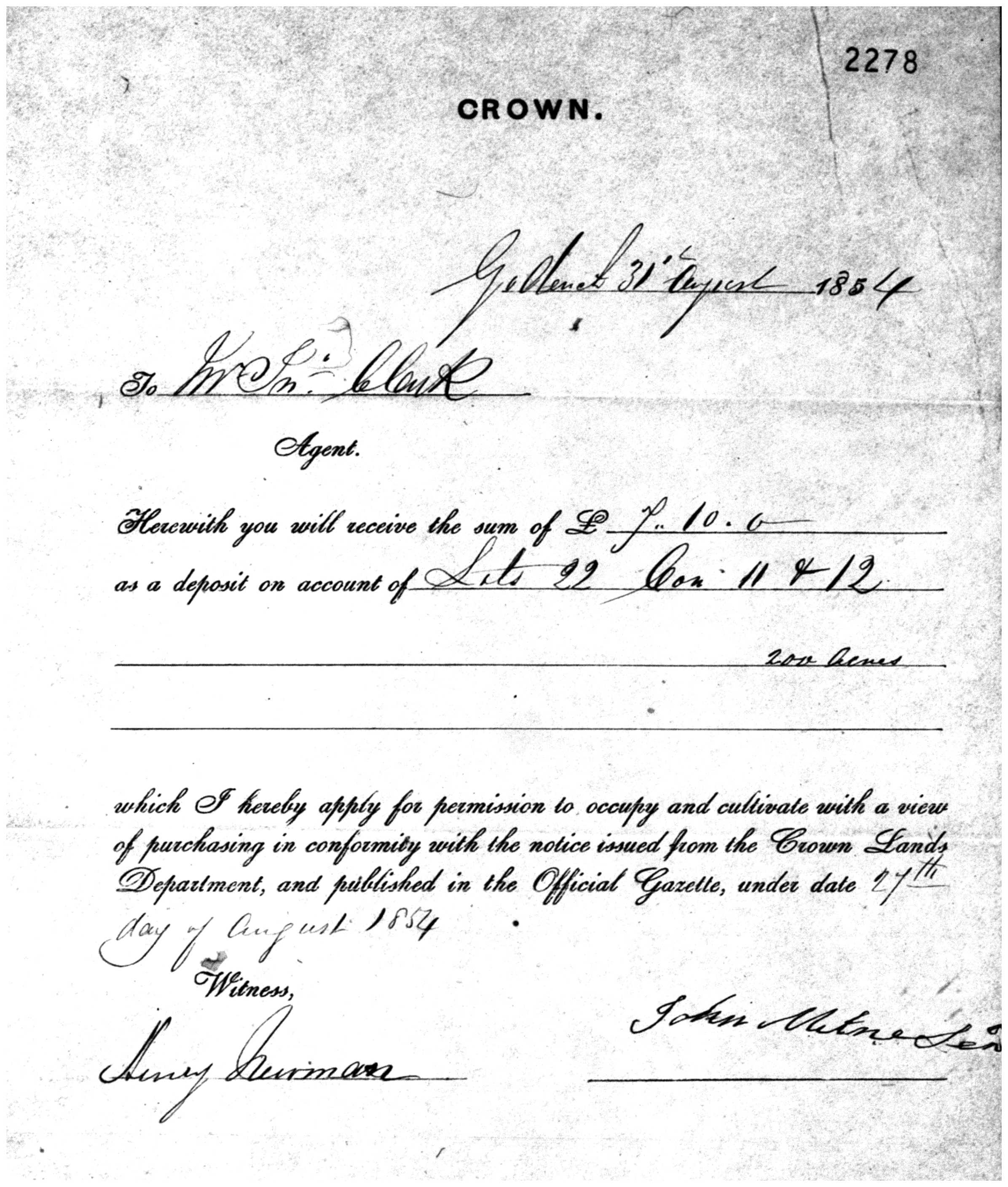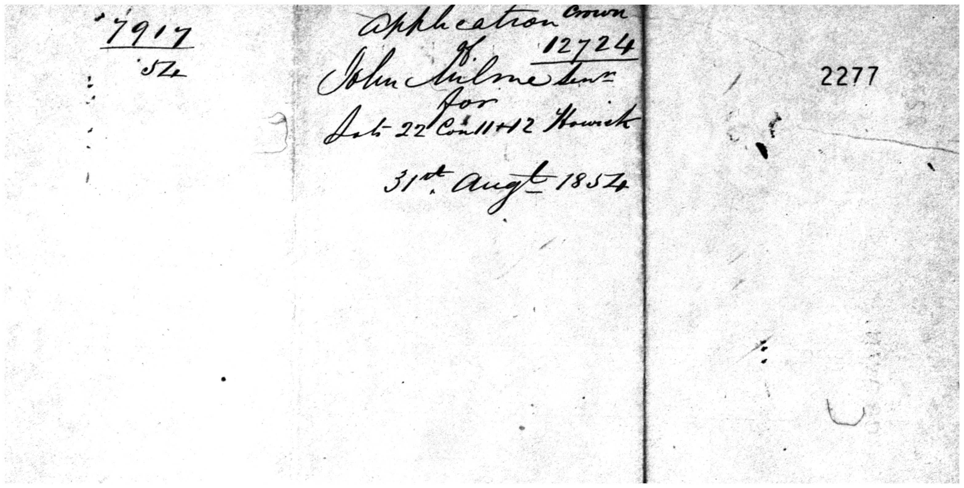 | Property | John Milne in applying for patents from the Crown in Huron County. He applied in 1854 at the same time his brother Fairly applied. |