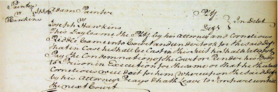 Event | Lawsuit October 16, 1766 (Age 30 years)Note: An Adam Painter and wife Elizabeth had interests in Frederick Co VA as late as 1766. Adam Painter was a plaintiff in a suit against Joseph Hawkins over a debt, Frederick County Order Book 13 1766-1767 p. 239, Oct. 16, 1766. The case was dismissed Nov. 6, 1766. There were several men named Adam Painter in that part of VA; if this is 'our' Adam it means he had a wife before his marriage to Demilla Broyles in Culpepper Co.