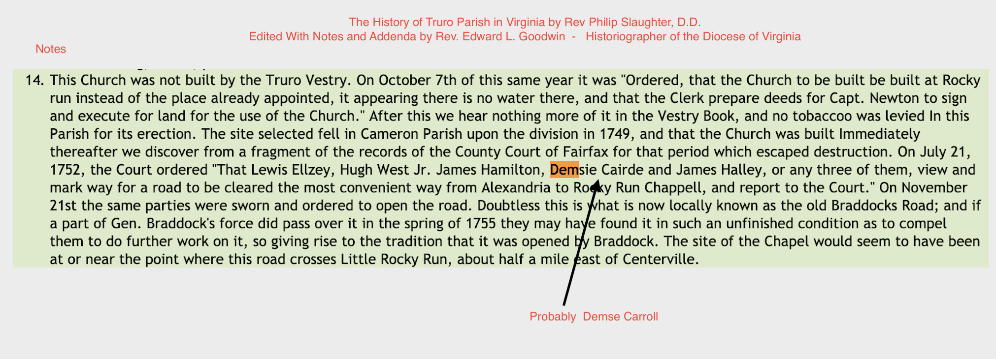 | Fact | Dempsey and others were assigned the task of laying out a new road from Alexandria Va to a new church built near Rocky Run Va. |