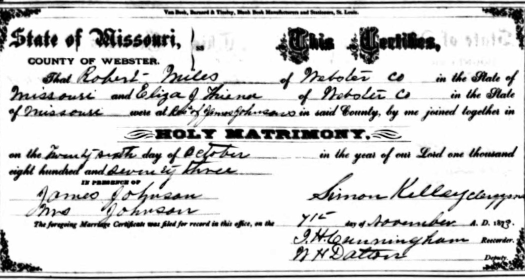 Marriage of a child | Robert MILES — Eliza Jane FRIEND — View this family Type: Religious marriage October 26, 1873 (Age 37 years)Address: James Johnson home in Webster Co. |