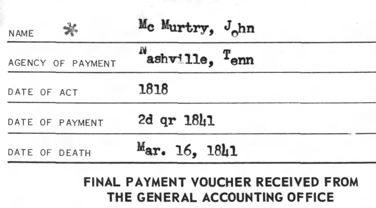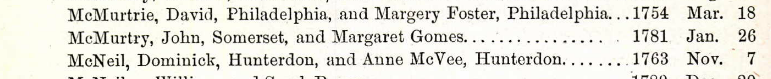 Several families from the Somerset Co., NJ area migrated together to Orange Co., NC. These include the Dorris, Gomer, Forrester, and Kirkpatrick families along with the McMurtrys. Along with the Blackard, Edwards and other families, members emigrated from Sumner Co. to White Co., IL beginning in 1818. John McMurtry Sr of Sumner County, TN John McMurtry Sr (son of James McMurtry and Agnes ) was born Feb. 15, 1751/2 in Somerset Co., NJ. Revolutionary War Pension documents indicate that John McMurtry Sr enlisted in June or July of 1775 in Captain James Chambers' Company of the First Pennsylvania Regiment, commanded by Colonel Kemp. During John McMurtry Sr's service, his regiment marched to Boston; after that siege was raised he marched to NY and Long Island, and fought at the Battle of White Plains and York Island. After the Battle of White Plains, he was appointed Sergeant. The army retreated across the Delaware River, and John McMurtry Sr was at both the battles of Princeton and Trenton. He was also at the battle of Germantown. About this time, he was appointed Sergeant-Major and was sent to recruit new soldiers in Pennsylvania. In September 1779, he was appointed Ensign of the First Pennsylvania Regiment. On June 30, 1780, he left the Continental Army and went to Philadelphia, and went to sea on board the privateer brig Fair America, commanded by Captain Stephen Decatur. He was a privateer, that is, a licensed pirate...(see DAR Patriot Index, page 459, for 1966). Many details of John McMurtry's life can be found in "Chronology of the Life of John McMurtry, Esq, soldier, privateer of the American Revolution: progenitor of the McMurtry clan of Tennessee" by Otis McMurtry. John McMurtry served as Magistrate in 1799 and was a farmer. His pension papers are available and are quite filled with information about Sumner County families besides McMurtry. John McMurtry Sr married Margaret "Peggy" Gomer, on January 29, 1781 in Somerset Co., NJ. (Sally Telford deposition in Rev. War Pension claim of Margaret McMurtry dated 1841 states that the marriage took place in her father's house in New Jersey).Because John McMurtry Sr and Peggy Gomer were married after his Revolutionary War service, she was at first denied a widow's pension. An Act of Congress accompanying House Bill 262, on Mar. 8, 1842, was required in order to grant her a widow's pension of $80 per year. Peggy Gomer was born Aug. 1, 1765 in Somerset Co., NJ and died on Apr. 4, 1846, in Sumner Co., TN. Her parents were Henry Gomer and Mary Sarah Dorris. Mary Sarah Dorris was an aunt to William Dorris, the progenitor of the Sumner Co., TN Dorris family. Record of John and Peggy's marriage can be found in the Archives of the State of NJ, First Series, Vol XXII, p 166. John McMurtry Sr died at the age of 89. His obituary was in the Nashville Whig, Friday, May 19, 1841: "McMurtry, John Esq Aged 89. Died at his residence in Sumner County on the 16th inst. A soldier of the Revolution". In his will, proved April Court 1841 and found on page 278 of the Sumner Co., TN wills: "Wife Peggy, plantation on which I live. My sister Jane Hammons, house and lots where John Carrott (Garrett?) Jr now lives. Children: Henry, John, Asa, Thomas Wilkerson, James Garrett, Polly Forester. Executors: Asa McMurtry, Thomas Wilkerson McMurtry, and Samuel Kirkpatrick." House Bill for Margaret (Peggy) McMurtry Tanscription of House Bill 262, of the second session of the 27th Congress. This bill granted a widow's pension to Margaret "Peggy" McMurtry, widow of John McMurtry, Sr. She was caught up in bureaucracy due to the timing of her marriage to John McMurtry Sr, his service in the Continental Army, his death and the passage ofseveral pension bills in Congress. It took an Act of Congress to obtain a Revolutionary War Widow's pension of $80 per year for her. Margaret McMurtry (to accompany bill HR No 262) March 8, 1842 Mr. Mathiot, from the Committee on Revolutionary Pensions, submitted the following: REPORT The Committee on Revolutionary Pensions, to whom was referred the petition of Margaret McMurtry or Sumner county, Tennessee, report: That on the 4th day of September, 1830, John McMurtry, the husband of petitioner, was allowed a pension under the act of March 18th, 1818, at the rate of eight dollars per month, for his services as a private in the revolutionary war. He left the army in 1780, and was married to the petitioner on the 29th day of January, 1781, as appears by the family record, which is proved to be in the handwriting of the said John McMurtry; and the marriage is further established by the testimony of two respectable witnesses, who were present, and saw them married. The said family record further shows, that the said John McMurtry died on the 16th day of March, 1841; and the papers accompanying her petition show, conclusively, that the petitioner is his widow. After the death of her husband, the petitioner applied to the Pension department for the benefit of thelaw in such case made and provided. Her claim, under the act of July 4th, 1836, was rejected by the Commissioner of Pensions, on the ground that her marriage took place after the termination of her husband's service; and relief was denied her under the act of July 7th, 1838, on the ground that her husband died after the passage of the law. The committee fully concur in opinion with the Commissioner of Pensions, that his case does not come within either the letter or spirit of the act of July, 1836. This act expressly confines the benefit of its provisions to those widows only whose marriage took place before the expirationof the last period of the husband's service, and the committee can well understand the reason of this distinction. The petitioner's case not coming within the provisions of this act, the next question is, is she entitled to the benefit of the act of July 1838? Her marriage is proved to have taken place prior to the 1st of January, 1794, by which her case is brought within the prov