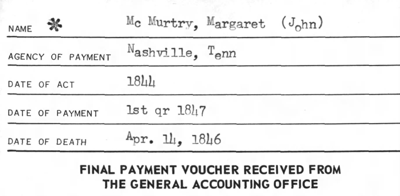 | Note | US Pensioners 1818-1872 Collection from Ancestry.com (Probable entry for Margaret GOMER McMurtry.) Margaret McMurtry of Tenn, widow of John, received pension after his death. She died 14 April 1846. (Nashville TN records.) |