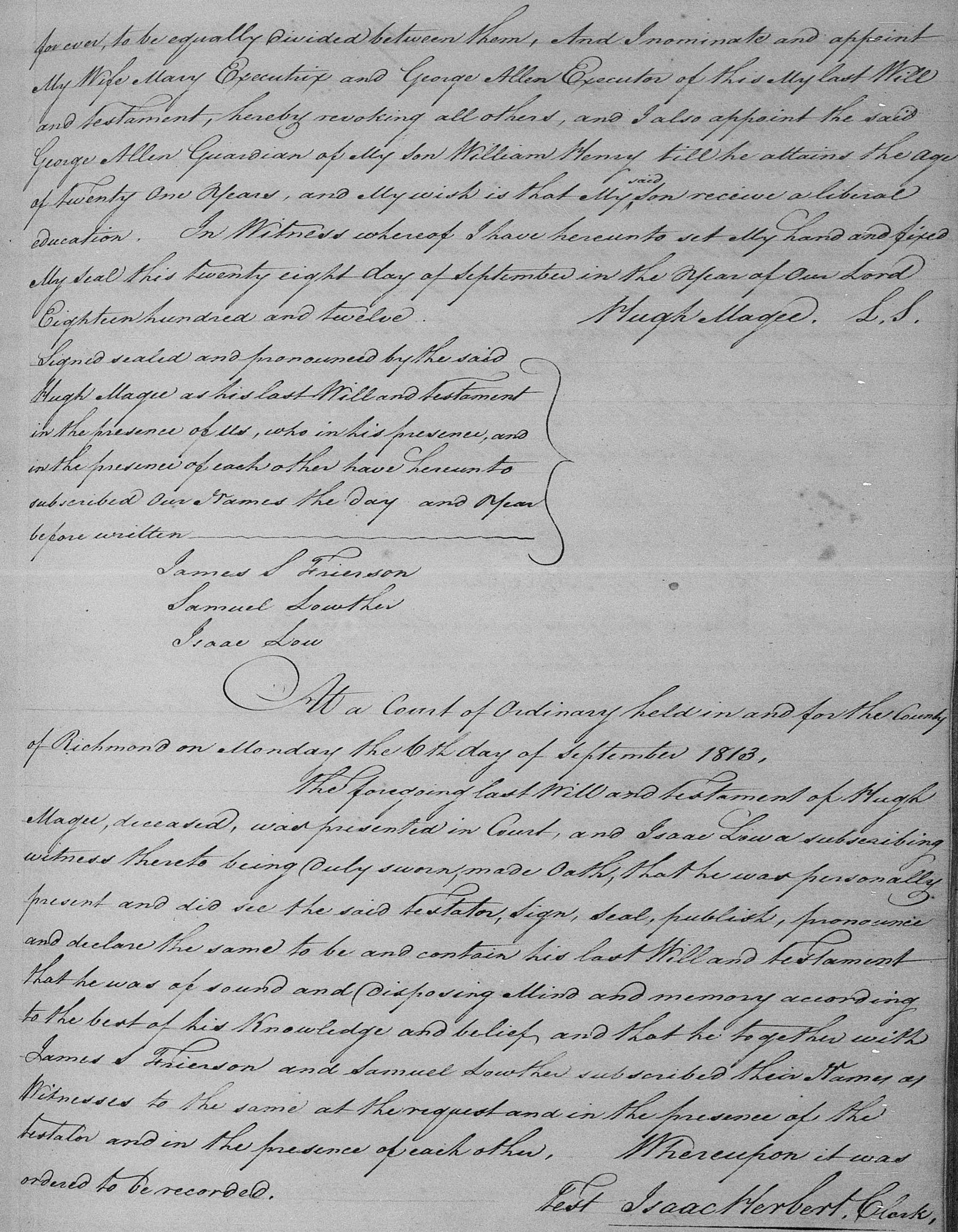 | Death | Will of Hugh Magee of Richmond County. Named wife Mary, son William Henry Magee, minor. Probated 6 Sept 1813. Georgia Probate Records, 1742-1990 Richmond Wills 1798-1853 vol A-B, pp 98-99 on familysearch.org. |
