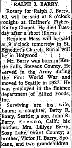 Ralph Joseph BARRY Birth: 1897 Death: May 7, 1957 — Seattle, King Co, WA |