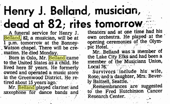Henry J BELLAND Birth: 1896 — New York Death: 1979 — Seattle, King Co, WA |