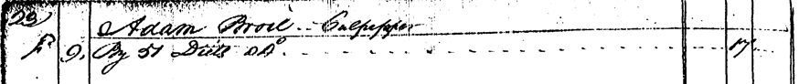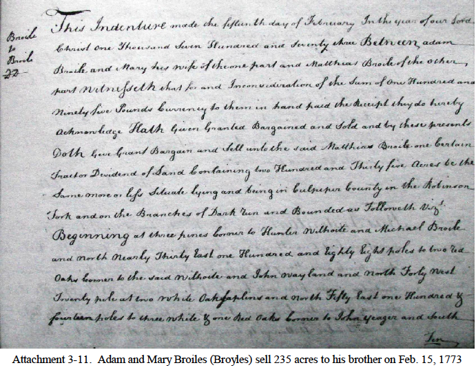 | Property | Adam had several properties in Culpepper Co Va. One was a grant for 375 acres on White Oak Run. From Virginia Northern Neck Land Grants: Adam Broyle of Culpepper Co. 275 A. surplus in 100A. on Island Run now called White Oak Run in said Co. part of 400 A granted George Moyer 24 Jun 1726 who conveyed said tract to Broyle by Deed. Resurvey by Mr Philip Clayton, Grant fo 375 A to Broyle. Adj Adam Yeager, Christopjer Moyer, George Moyer. 3 Aug 1764. and he had another grant for 68 acres in 1868 on a Hill at the Head of Tims River in Culpepper Co. |