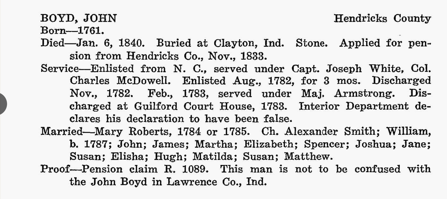 | Note | Synopsis of John Boyd's application for Rev War Pension taken from Clanboyd.info. BOYD, John, Mary, R1089, NC Line, soldier applied 11 Nov 1833, Hendricks County, IN aged 72 a resident of Guilford Twp, IN, lived Burke County, NC at enlistment, a William Boyd was a witness to Soldier's affidavit in 1833, widow applied 13 June 1843, Hendricks County, IN aged 76, soldier married Mary Roberts in Surry County, NC in June 1785 and they moved to Green County, TN then back to Surry County, NC then moved to Gracen (Grayson) County, VA then moved to Hawkins County, TN then back to Surry County, NC then to Hendricks County, IN, soldier died 6 Jan 1840, soldier and widow had 15 children: Alexander Smith Boyd who died shortly after birth, William Boyd born 22 Feb 1787, John Boyd born 20 Nov 1788, James 15 Oct 1790, Matthew born 18 Aug 1792, Martha, Elizabeth born 30 Mar 1794, Spencer born 19 Feb 1796, Joshua born 15 Oct 1797, Jane born 4 Oct 1799, Susan or Susy born 1 (Apr) 1801, Elisha Boyd, Hugh Boyd, Matilda Boyd and one not named, 10 were living in 1843, soldier was born 28 Dec 1761, soldier's daughter Martha Hiatt was aged 50 in August 1842. |
