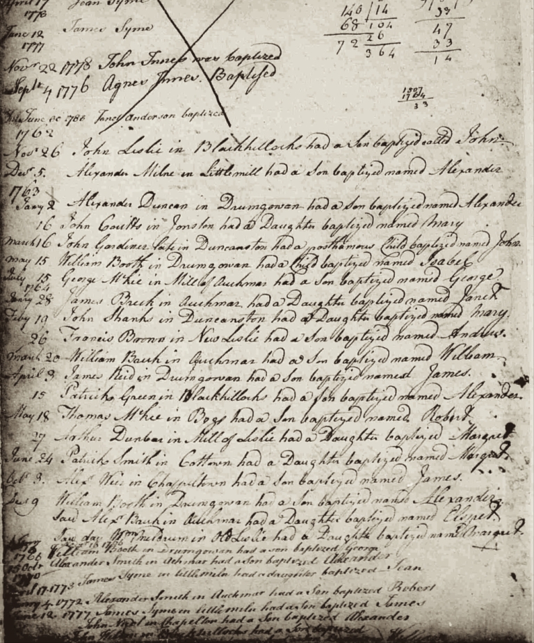 | Media object | Format: image/jpeg Image dimensions: 1,874 × 2,464 pixels File size: 1,639 KB Type: Document Highlighted image: no Note: The baptism of three children of William Booth of Drumgowan - Isabel, Alexander and George - are clearly listed in the Leslie Parish Baptism Records. (At the bottom of the page, it is purported to be the baptismal entry for son William, baptized in 1778. (Unreadable in the digital copy online.)
