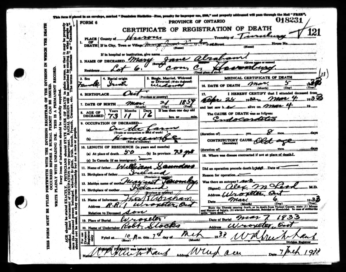 Death | March 5, 1933 (Age 73 years) Note: Mary Jane's residence was in rural area close to Wroxeter.