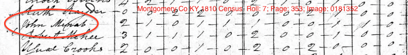 | Birth | It is likely that John McNabb's father was Andrew McNabb and that he was born in Chester Co or Lancaster Co PA. John was almost certainly not born in Montgomery Co KY as is reported by many genealogists. According to Montgomery Co Deed Book, Andrew McNabb mortgaged land where he lived in Bourbon Co KY to John McNabb of Montgomery Co in 1802. |