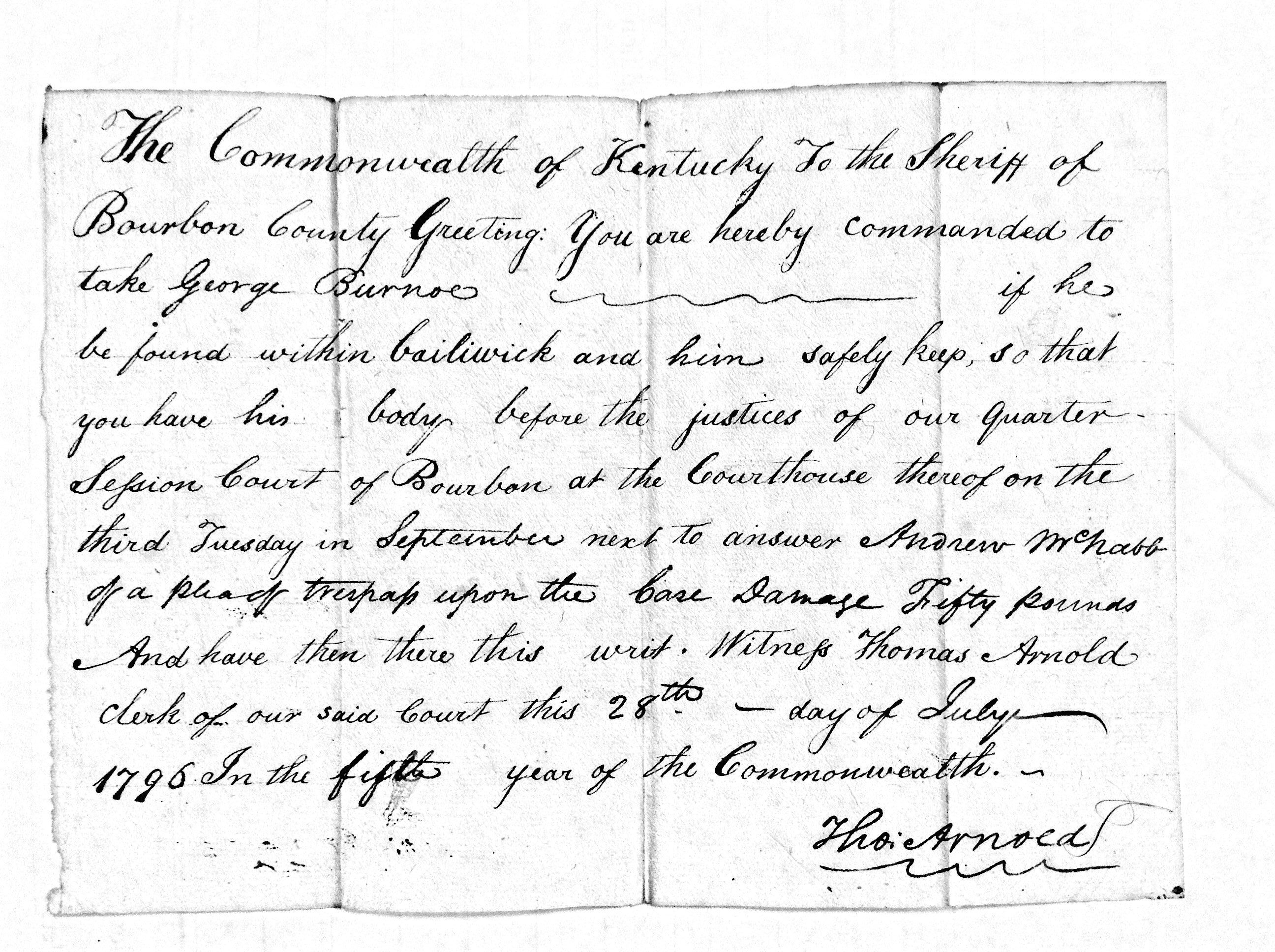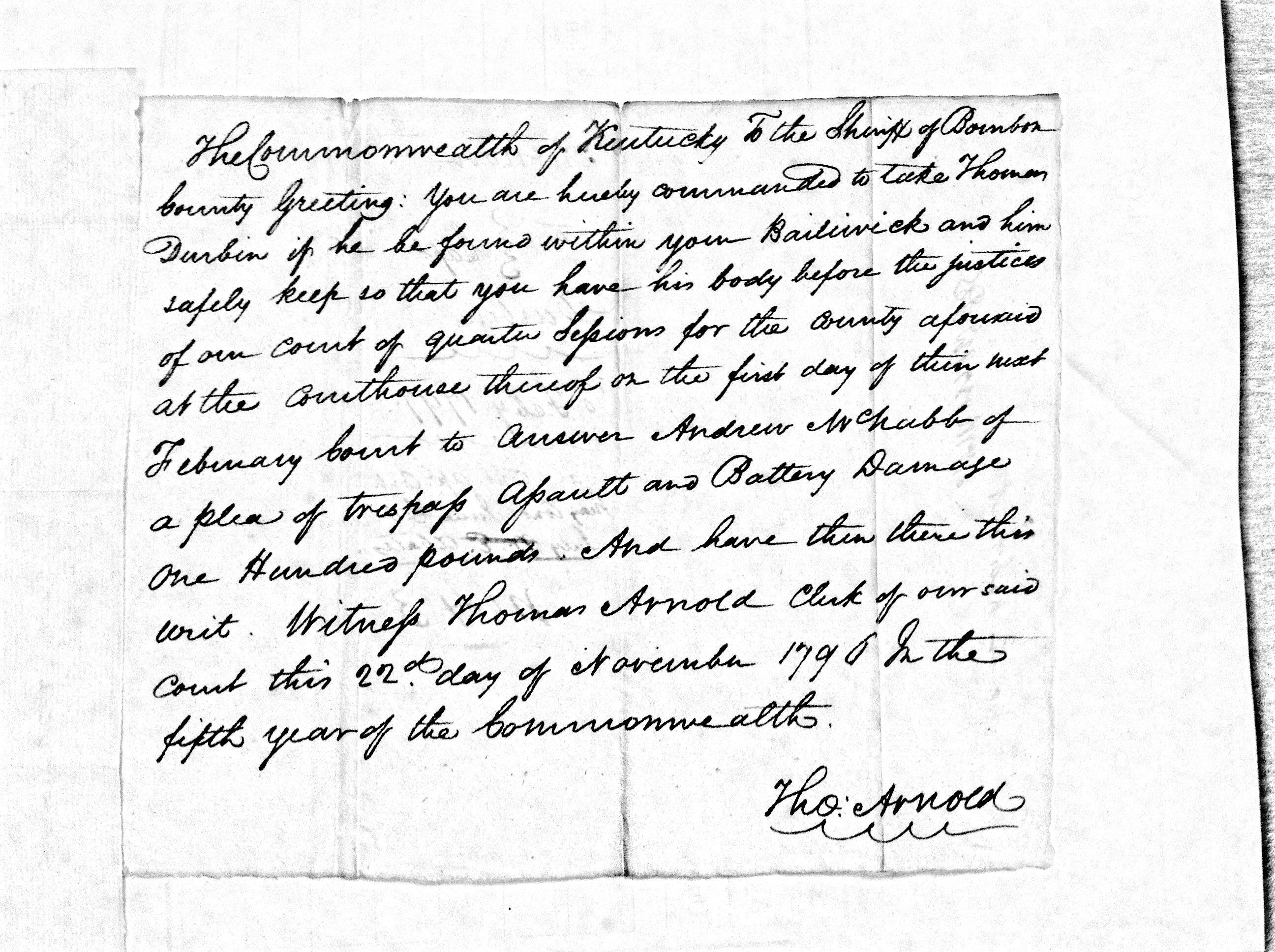 Event | Lawsuit 1796 (Age 65 years)Note: Andrew had trouble with some of his neighbors, Thomas Durbin and George Burnoe. He charged both of them with trespass assault and battery charges in court. The Sheriff was ordered to bring both men in to face the charges.