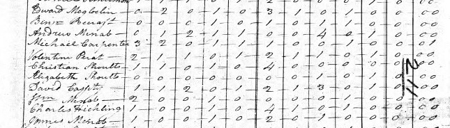 | Census | Andrew McNab was living besides Michael Carpenter and Edward Magolin(sic, probably McClaughlin). Both men were listed in Andrew's estate 5 years later in 1815. There were 10 white people in his household, 2 adult males, one about 40 and the other over 40. Living close by were James McNabb and William McNabb, both about 40 years old, probably the sons of Andrew McNabb. |