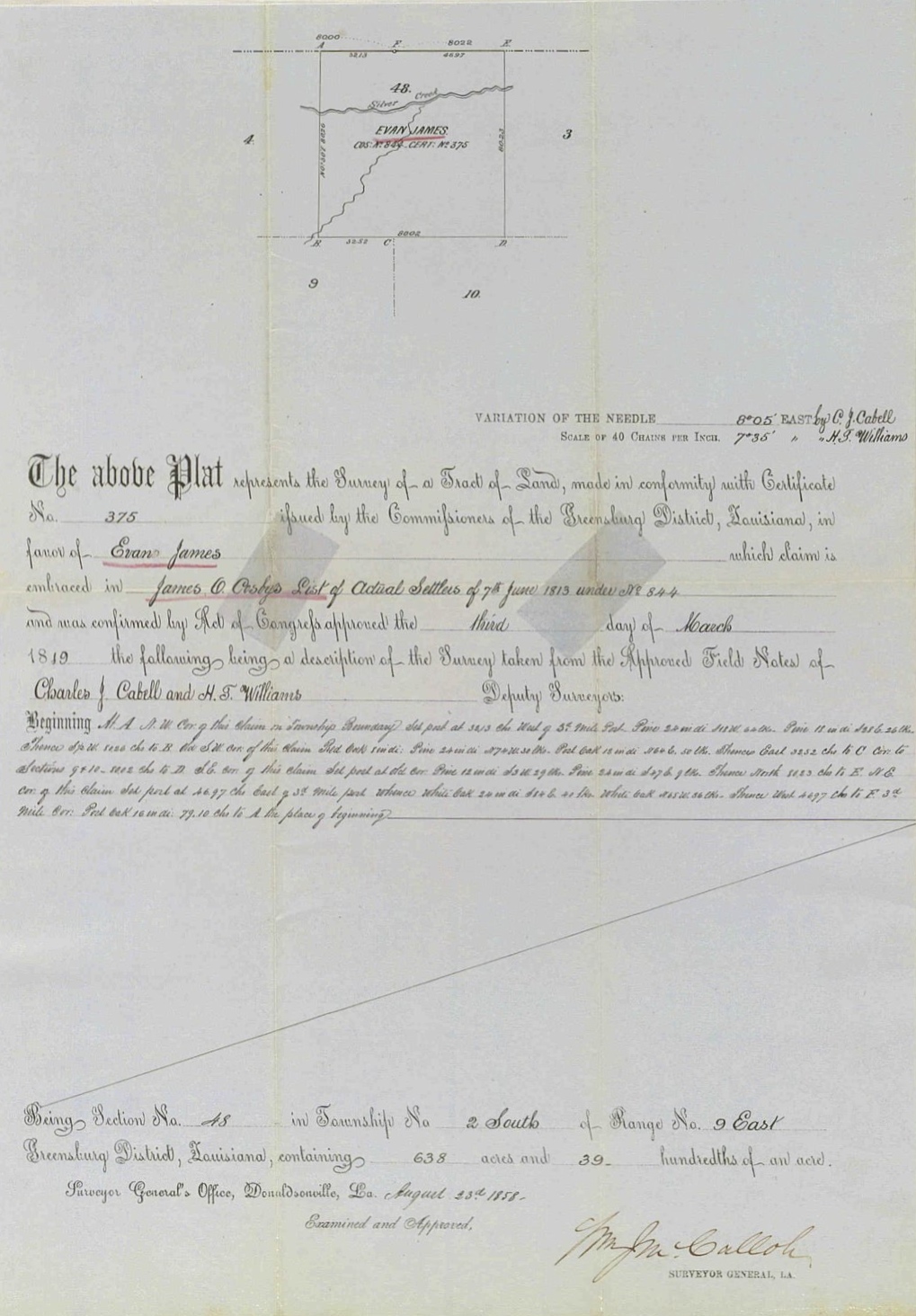 Property | Land 1813 (Age 36 years)Note: By 1813 Evan James had land very close to Jonas Short and Jonathan Magee in 1813, according to his Certificate of Ownership in 1819. Evan James had adjoining property in Greensburg District, T1S-R9E & T2S-R9E, in St Tammany Parish LA. He must have taken over Jonas Short's land in T2S-R9E.