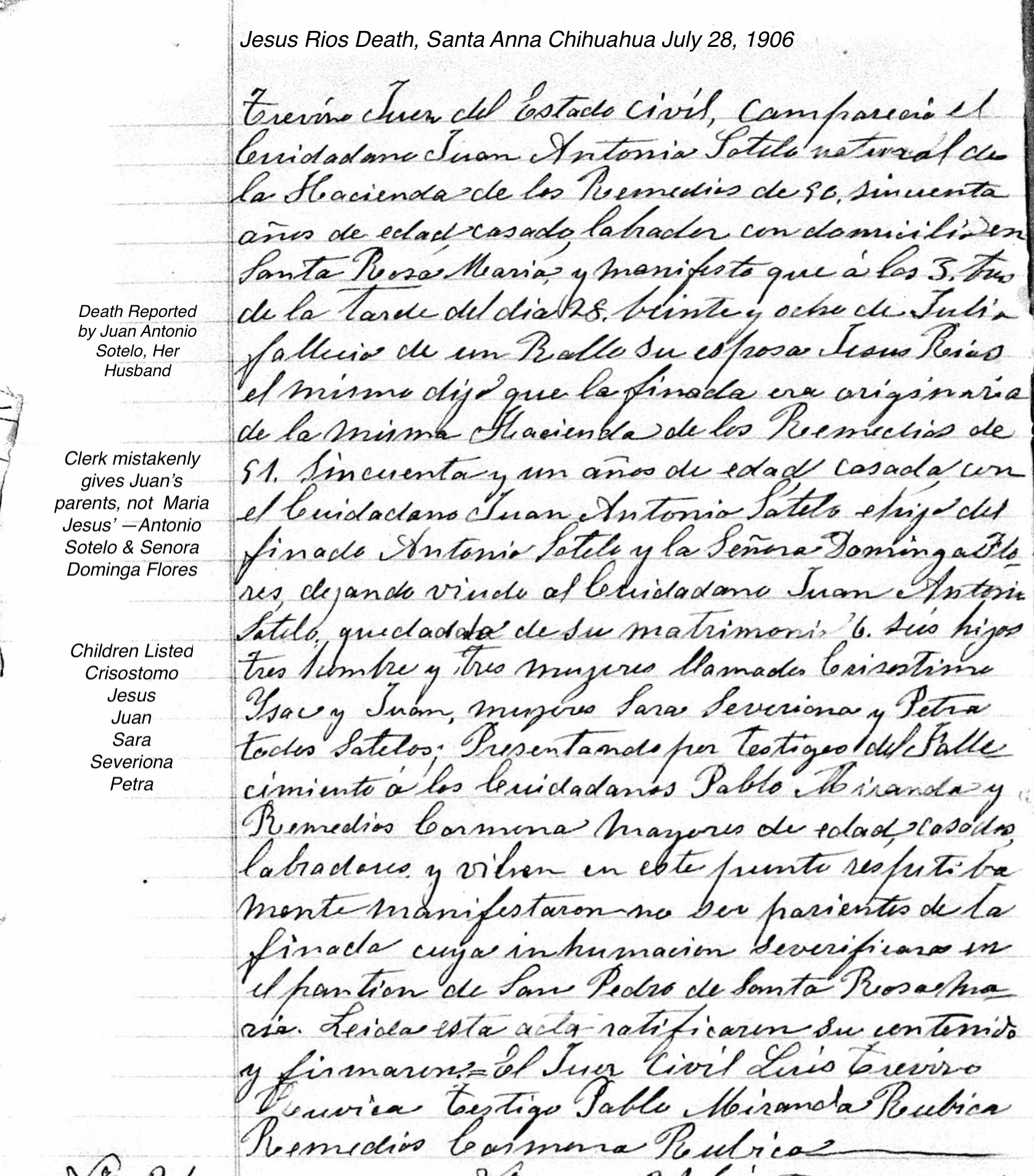 | Death | Chihuahua, Mexico, Civil Registration Deaths, 1861-1987 for Jesus Rios Death Registration Date: 28 jul. 1906 Death Registration Place: Santa Ana, Chihuahua, México (Mexico) Spouse: Juan Antonia Sotelo Spouse Father: Antonio Rios Spouse Mother: Dominga Flores Page Number: 12 There are many errors in the indexing of this record. Jesus is female 51 years old, not male 91 years old. The parents listed are for her spouse, not for Jesus. |