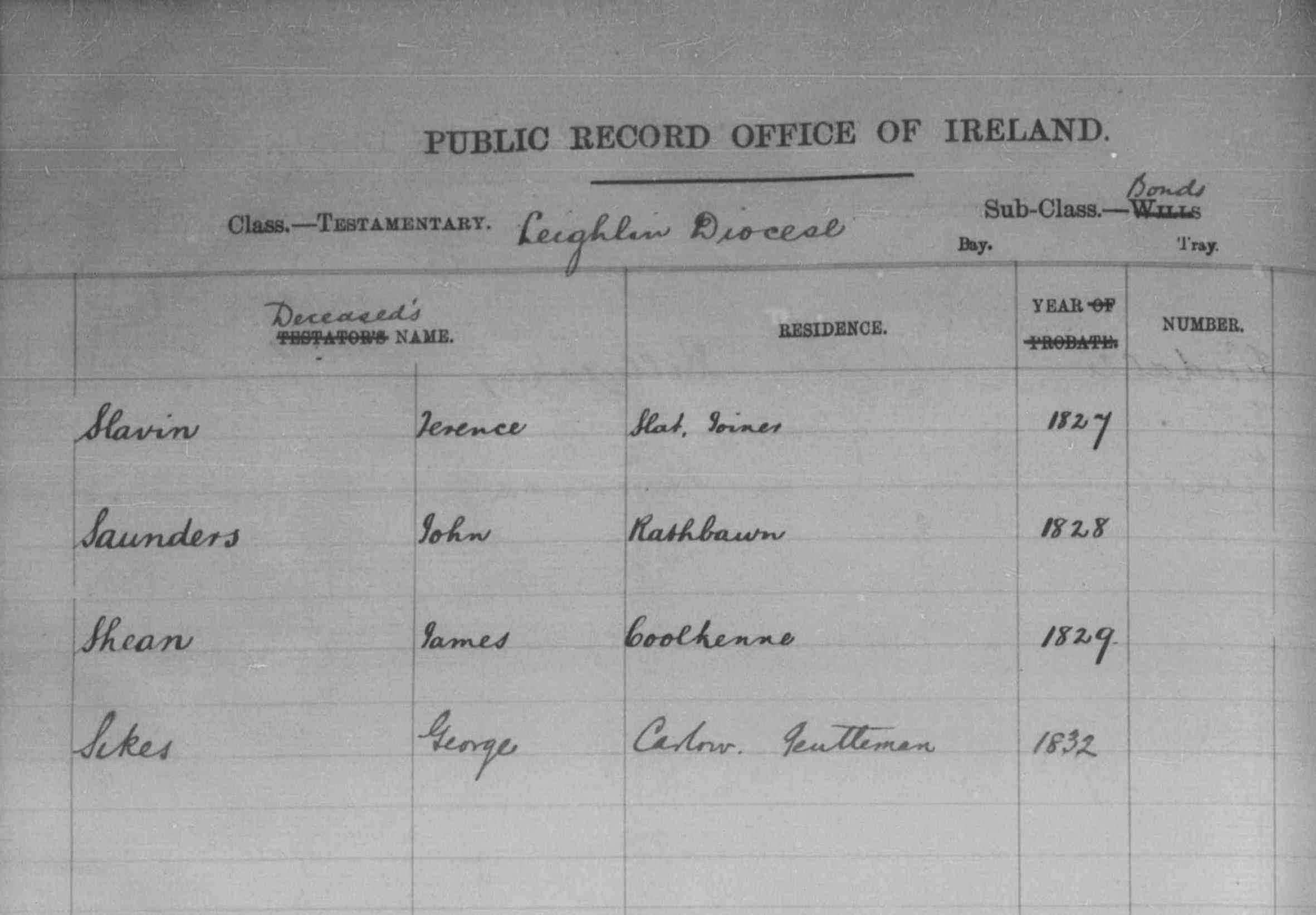 | Probate | The following entry surely refers to John Saunders of Rathbawn (Rathbane) which is part of Hacketstown Parish of Leighlin Diocese. The date agrees with the records of the Coolatin Estate which shows John had been replaced by his 18 year old son on the lease in 1828. Ireland Diocesan and Prerogative Wills & Administrations indexes 1595-1858 Transcription First name(s) John Last name Saunders Year 1828 Residence Rathbawn Diocese Leighlin Country Ireland Class Testamentary Record set Ireland Diocesan And Prerogative Wills & Administrations Indexes 1595-1858 Category Birth, Marriage & Death (Parish Registers) Subcategory Wills & probate Collections from Ireland From findmypast |