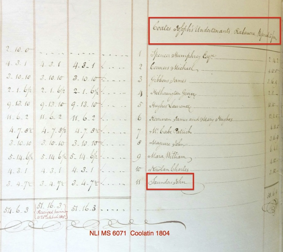 Residence | 1804 Note: The earliest mention of John Saunders of Rathbawn in the Coolatin Estate records was in 1804 in the Rental Book (MS 6071). John Saunders was listed as an undertenant of Joseph Coates farming about 3 Irish acres.