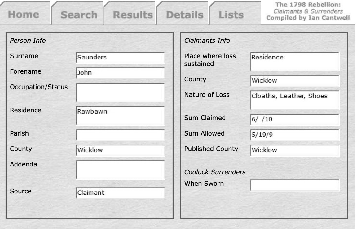 | Residence | John Saunders was a resident of Rathbawn before the earliest records of the Coolatin Estate have indicated. When the 1798 Rebellion spread through Carlow and Wicklow many residents lost property and lives. Those who survived were able to apply to the British government for reparations. John Saunders of Rathbawn was one of those claimants. 1798 Claimants and Surrenders John Saunders Residence Rawbawn (Rathbawn) County Wicklow Place Loss Sustained Residence County Loss Sustained Wicklow Nature Of Loss Cloaths, Leather, Shoes Sum Claimed 6/-/10 Sum Allowed 5/19/9t |