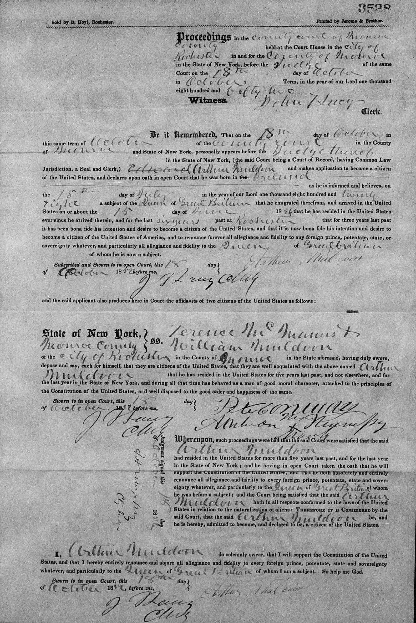 Emigration | about 1846 (Age 17 years) Note: Arthur's Naturalization papers were found in Monroe Co, NY. He stated in 1852 he had come to USA in 1846..