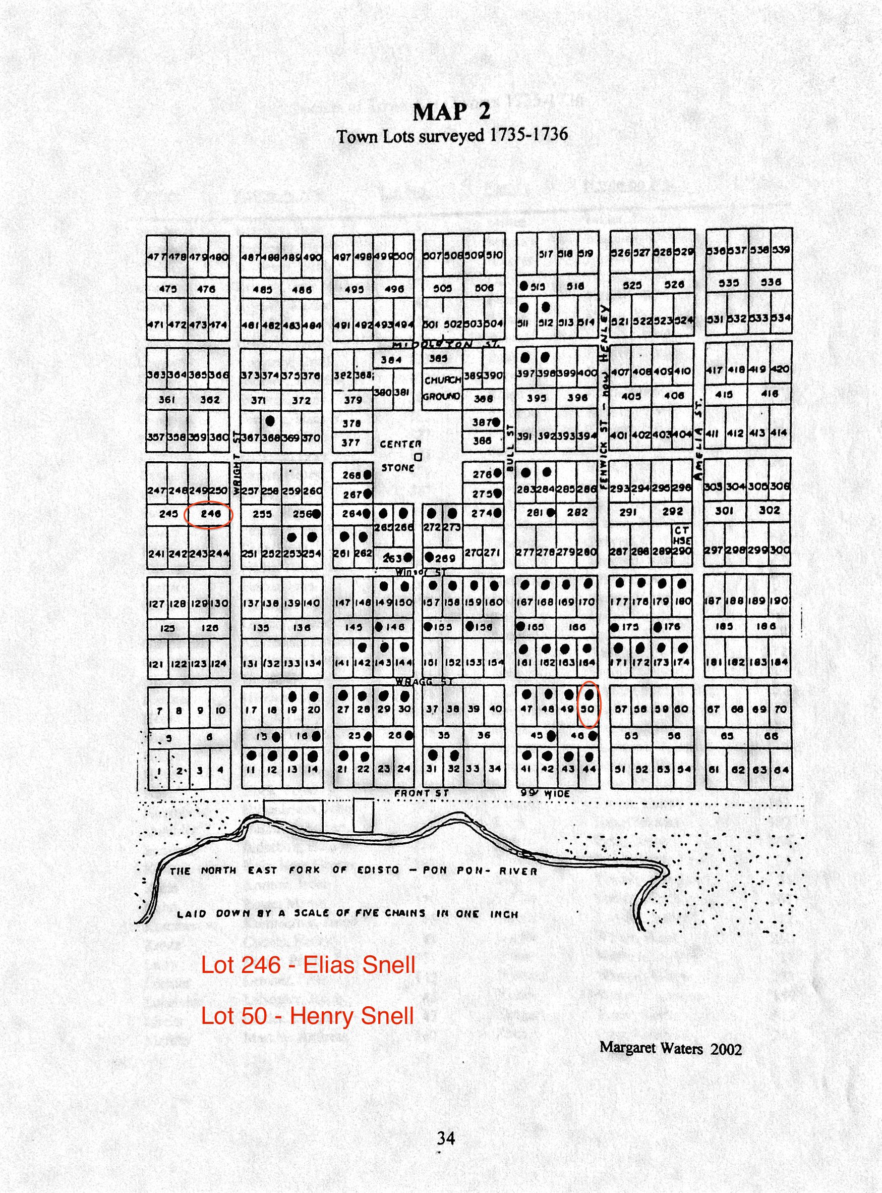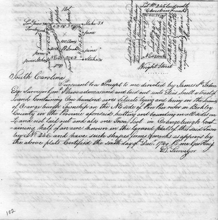 | Property | Elias and his father Henry had farm land close to each other NE of the town of Orangeburg SC. They also had town lots in the original Orangeburgh SC plats. 1740 Deed of Elias Snell Source: Microfilm of original deed located at SC Archives " . . . laid out unto Elias Snell a tract of land containing one hundred acres situate lying and being in the limits of Orangeburgh Township on the NE side of Pow Pow river in Berkley County in the province aforesaid butting and bounding on all sides on land not laid out and also one town lot in Orangeburgh containing half of an acre known in the grand plat of the said town by No. 246 and have such shape form and marks as appear by the above plats certified the sixth day of Dec 1740." (Town lot was located on Wright Street.) Submitted by: Darlene Athey Hill |