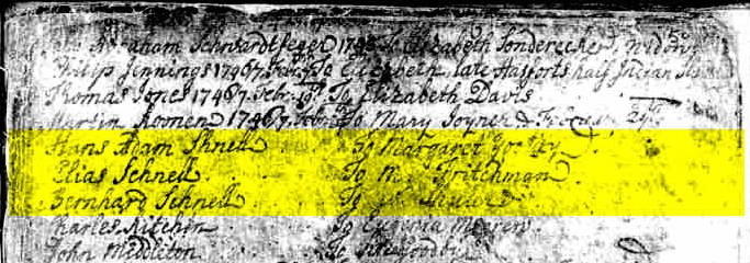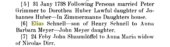 | Marriage | 1738 Jan. 31 I \"married Elias Schnell - son of Henry Schnell to Anna Barbara Meyer - John Meyer daughter\" (Hans Ulrich Giessendanner, the elder) |