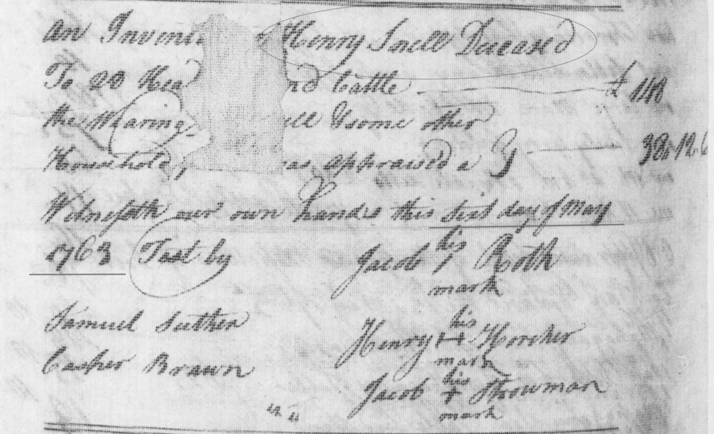 Henry Snell, X, his mark. Signed Sealed Published & pronounced by the Said Henry Snell Senior as his Last Will and Testament in presence of Peter Faure, Bernard Hartzog, Mary Hartzog (her mark). Proved before his Excellency the Governor in the Court of Ordinary Feby. 25 1763. At the same time qualified Adam Snell as Executor.