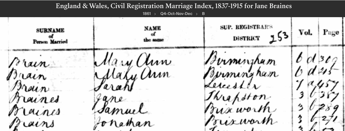 | Note | It is possible that Jane Braines, born 1836 in Keystone, is the daughter of Mary Braines who was unmarried at that time. I have placed her as daughter of Mary's sister Thomas Braines Jr, but there is no proof one way or another. |