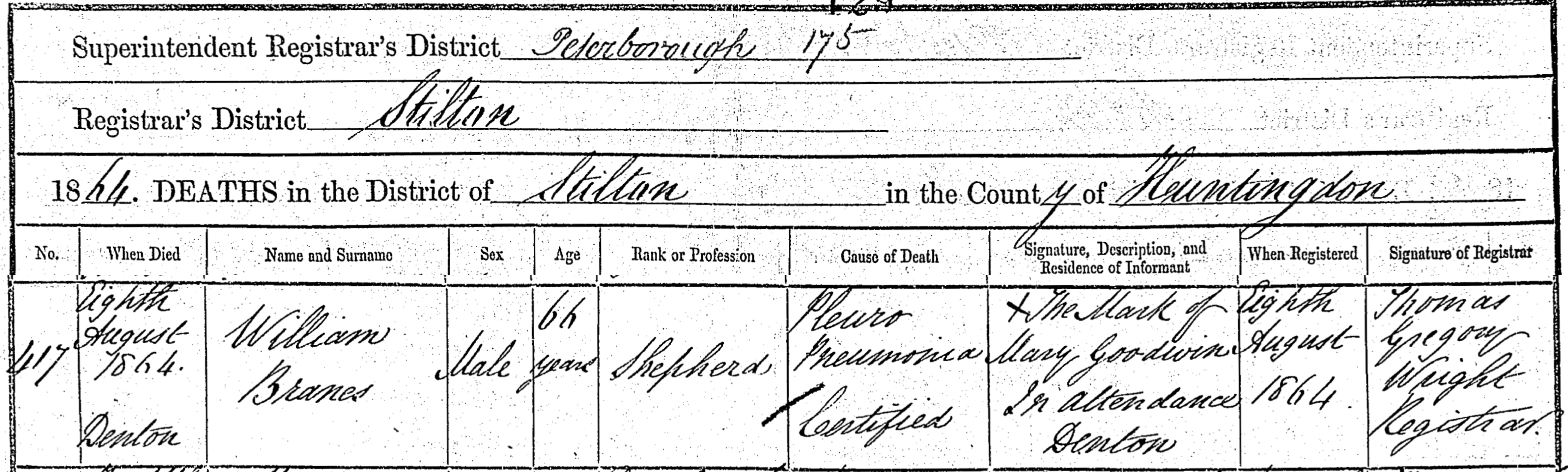 Death of a father | Thomas BRAINES June 26, 1850 (Age 48 years) Age: 84 Note: GRO Record: Thomas Braines, age 84, Shepherd, died Keyston, witnessed by Sophia Rawson, Reg District Thrapston, Subdistrict Raunds, Huntingdonshire. Burial record in Keystone Parish stated: Thomas Braines, age 84, Abode Keystone, Buried Jun 28, 1850. SOG HU/R 38