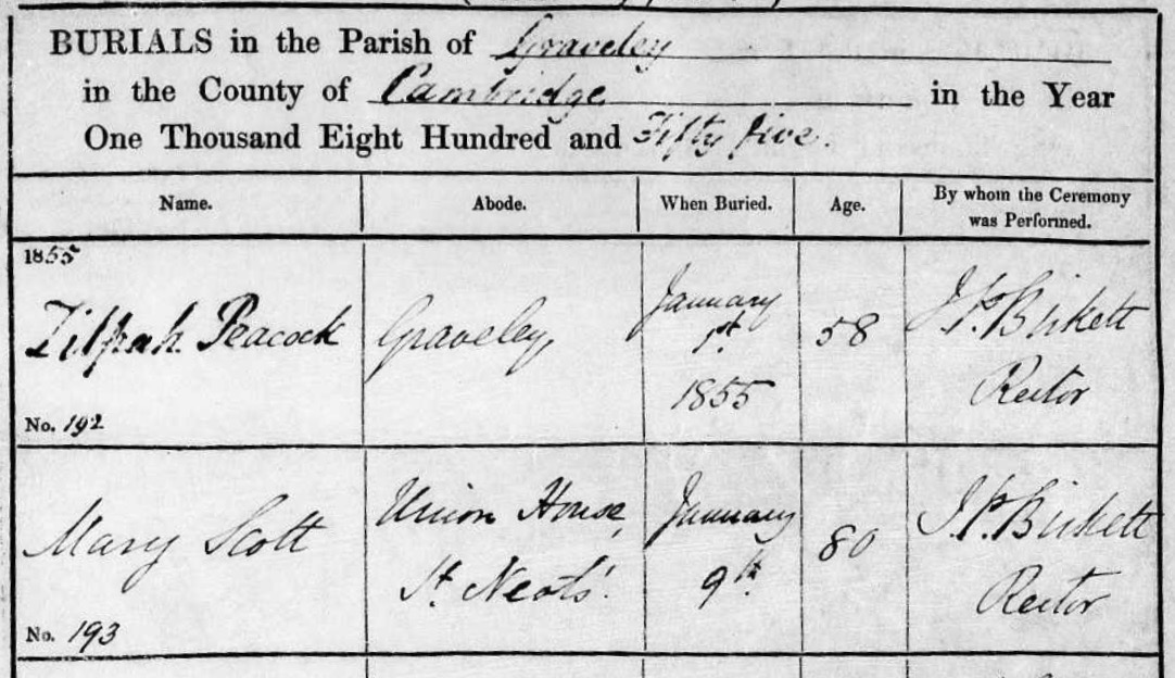 | Shared note | Burial Records for Graveley: Jane Scott 49, 17 Mar 1845 Thomas Scott 71, 7 Jan 1854 Mary Scott 80, 11 Jan 1855 (Union House, St Neots) |