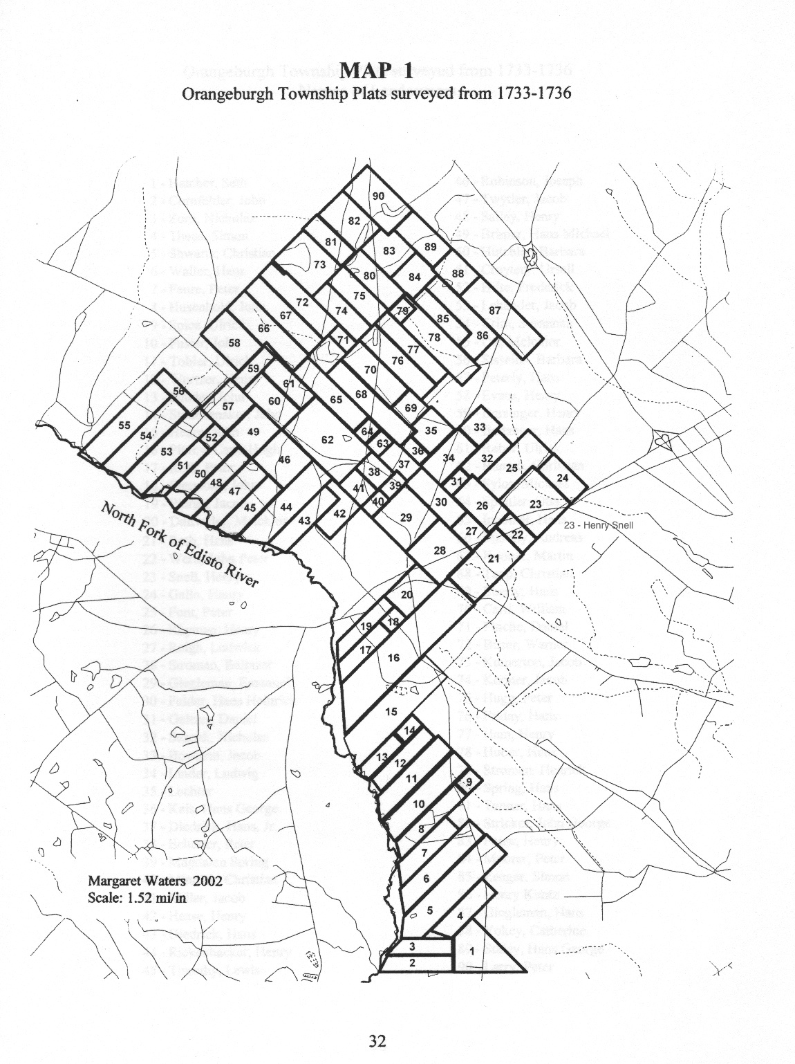 | Property | Henry was an early, original landowner in Orangeburgh. Deed of Henry Snell, 1737 \" . . . laid out unto Henry Snell, a tract of lands in the limits of the township of Orangeburgh on the NE side of Pow Pow River in Berkley County containing three hundred and fifty acres butting & bounding to the NE & SE on land not yet laid out, to the SW on land belonging to Henry Horger, & to the Northwest on land laid out to Bartholomew Gortman & hath such shape form and marks as appears by the above plat. Certified the 13th day of October 1737. Certified by G. Hunter, 8 Nov 1743. George Haig, Surveyor.\" Plat shows Bull Swamp running through land, and land being bordered by pine and hickory. Henry Snell also received Town Lot #50. (Town lot was on the western corner of Wragg & Fenwicke Streets, adjacent to the town lots of Henry Foust and Jacob Kummerton -- per Julian D. Kelly.) |
