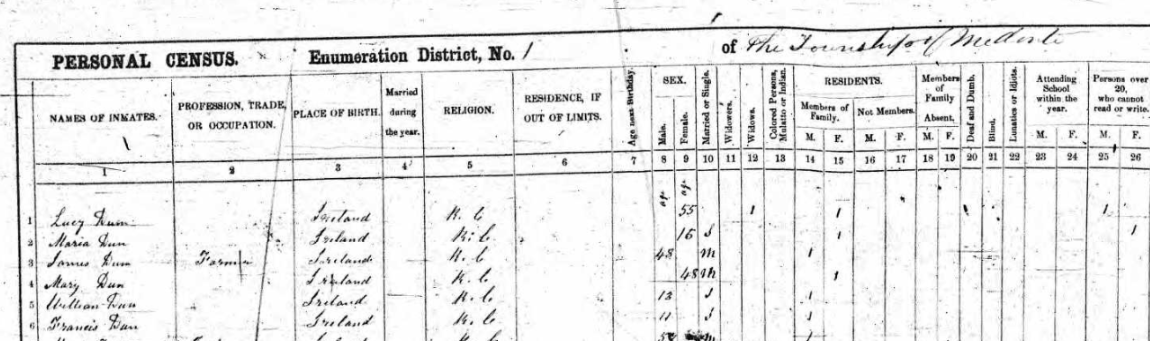 | Census | Lucy Dunn Birth Place: Ireland Marital Status: Widowed Religion: Roman Catholic Origin: Irish Province: Ontario District: Simcoe North District Number: 42 Division: 02 Subdistrict: Medonte Subdistrict Number: i William Dunn 35 Anne Dunn 34 John F Dunn 8 Elizabeth A Dunn 6 Luke Dunn 5 Mary Jane Dunn 3 Lucinda Dunn 1 Lucy Dunn 65 Luke Dunn 30 |
