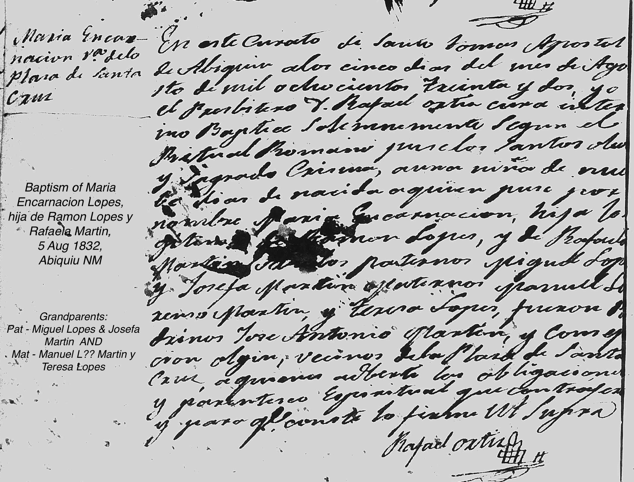 Maria Encarnacion LOPES Baptism: August 5, 1832 18 23 — Santo Tomás Apóstol, Abiquiu, Rio Arriba, New Mexico |