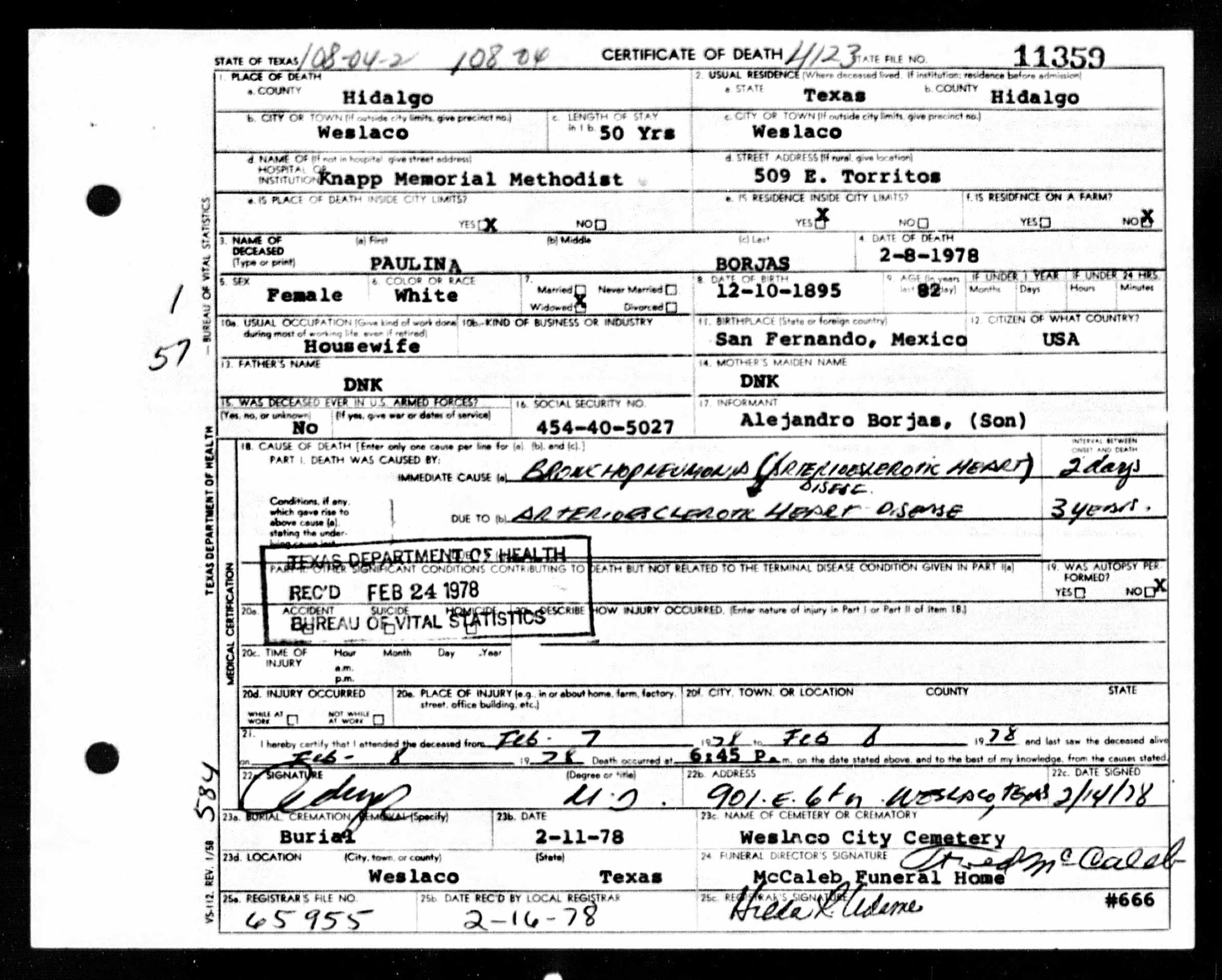 Paulina HERNANDEZ Birth: December 10, 1895 — San Fernando De Presas, Tamaulipas, Mexico Death: February 8, 1978 — Hidalgo Co, Tx |