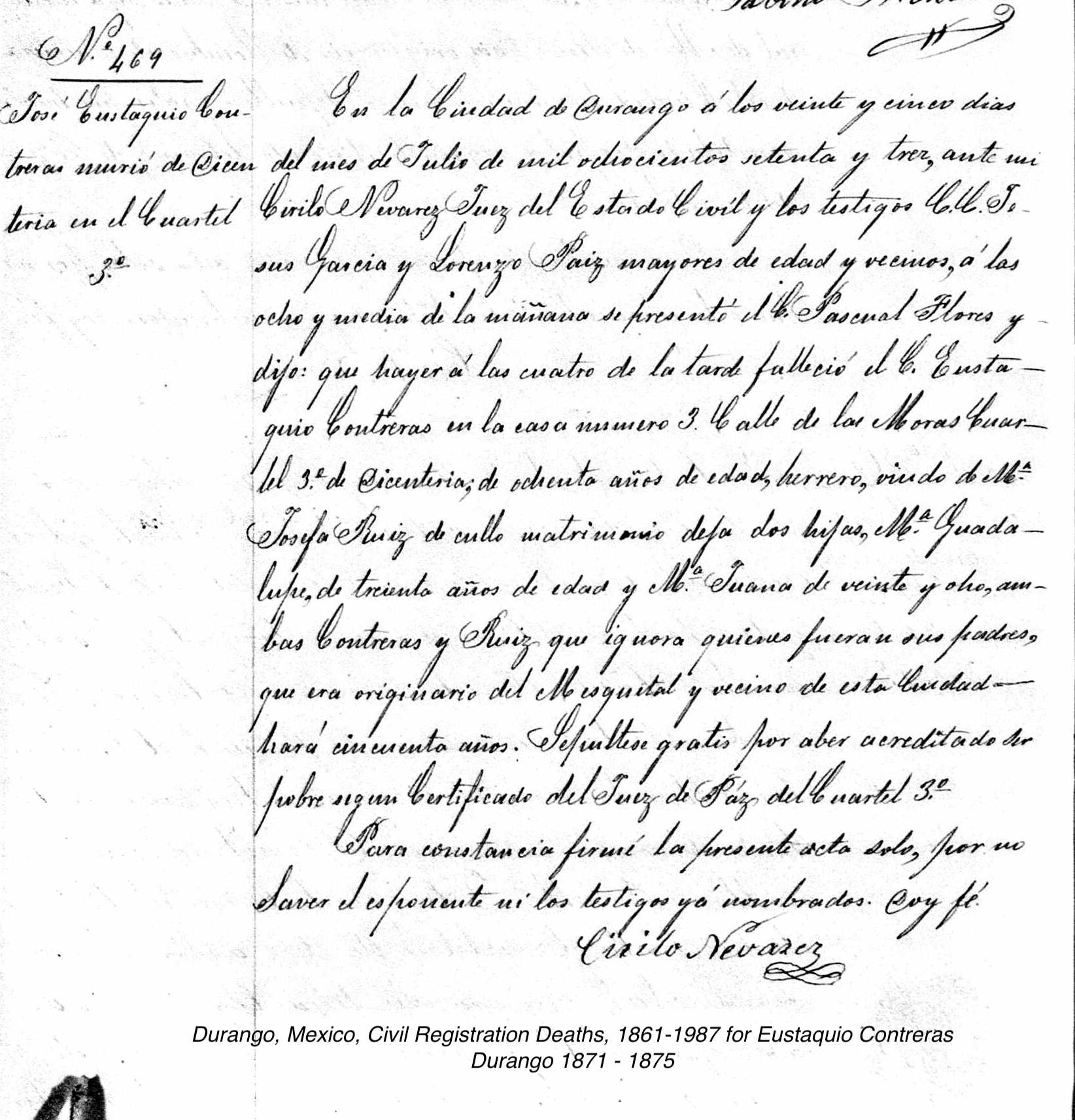 | Birth | Durango, Mexico, Civil Registration Births, 1861-1930 Name: MA de los Nieves Guadiano [María de los Nieves Guadiano Contreras] Gender: Mujer (Female) Birth Registration Place: Durango, Durango, México (Mexico) Registration Date: 9 ago. 1861 (9 Aug 1861) Father: Eugenio Guadiano Mother: Juana Contreras Page Number: 135 Born after her father Eugenio had died in July. |