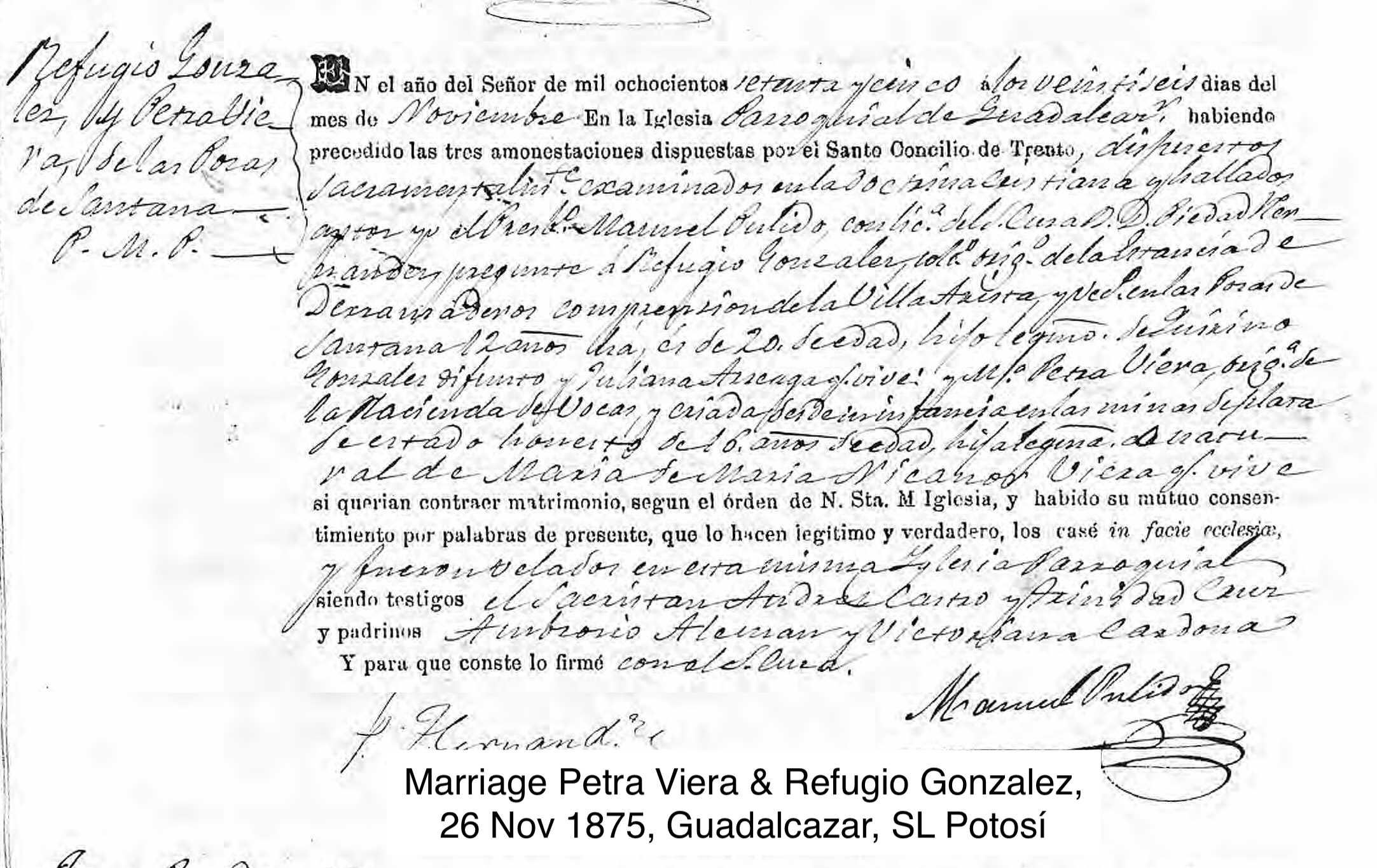 Marriage: November 26, 1875 — Guadalcazar, San Luis Potosi, Mexico |