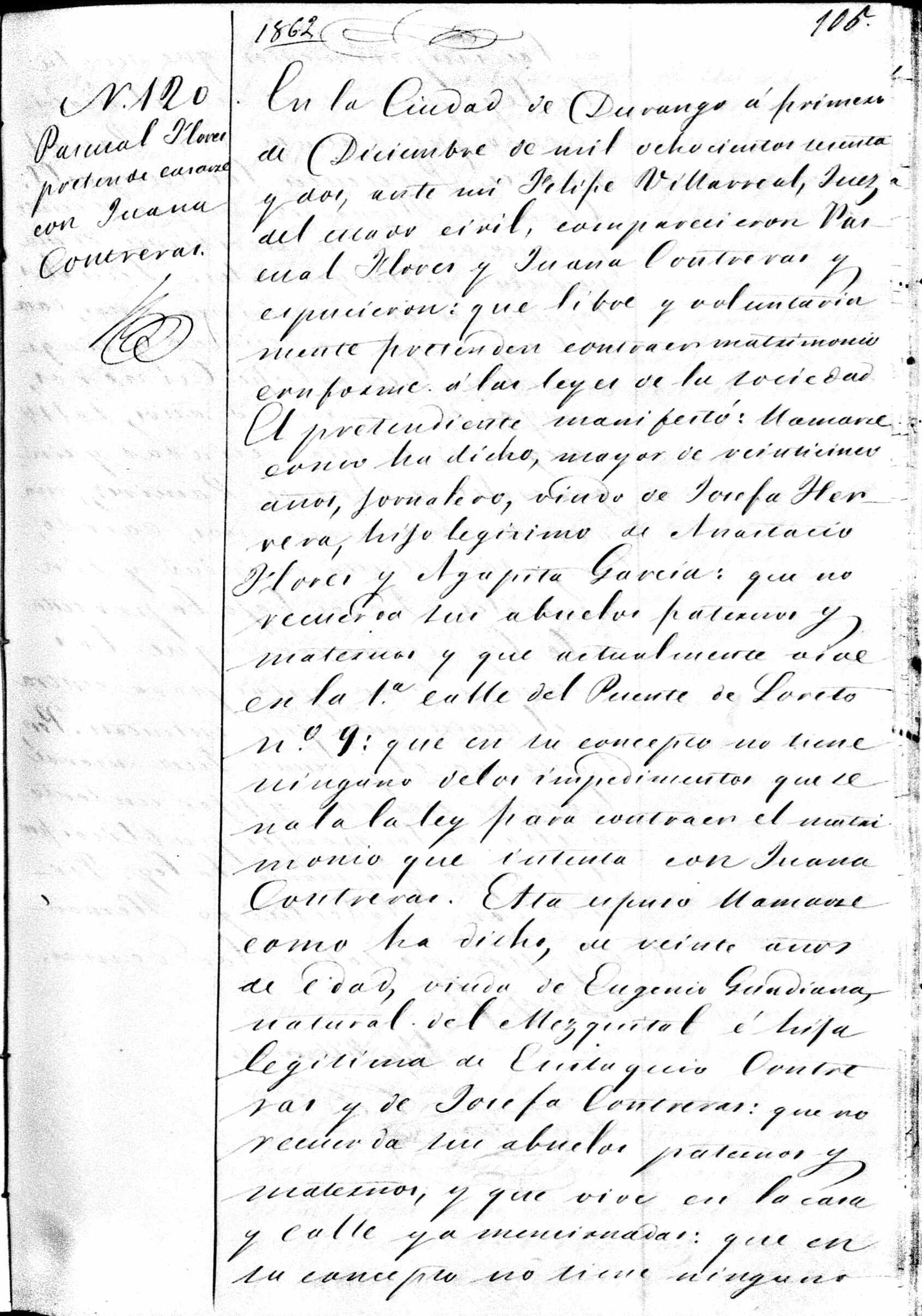 | Marriage | Durango, Mexico, Civil Registration Marriages, 1861-1951 Name: Juana Contreras Age: 20 Birth Year: abt 1842 Registration or Marriage Date: 1 dic. 1862 (1 Dec 1862) Registration or Marriage Place: Durango, Durango, México (Mexico) Spouse: Pascual Flores Father: Eustaquio Contreras Mother: Josefa Contreras |