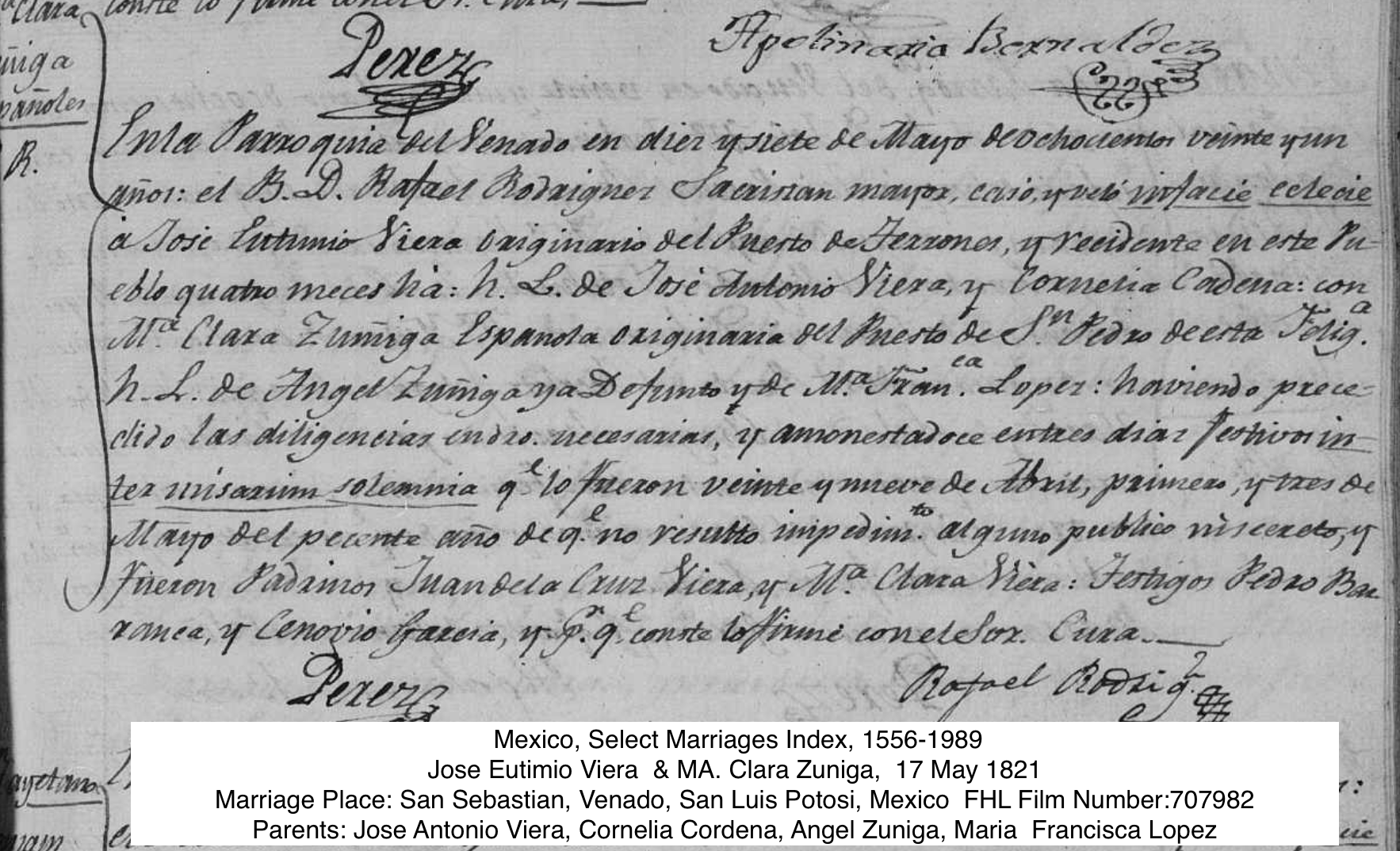 | Marriage | Mexico, Select Marriages Index, 1556-1989 For Jose Eutimio Viera Marriage Date: 17 may. 1821 (17 May 1821) Marriage Place: San Sebastian, Venado, San Luis Potosi, Mexico Spouse: MA. Clara Zuniga FHL Film Number: 707982 |